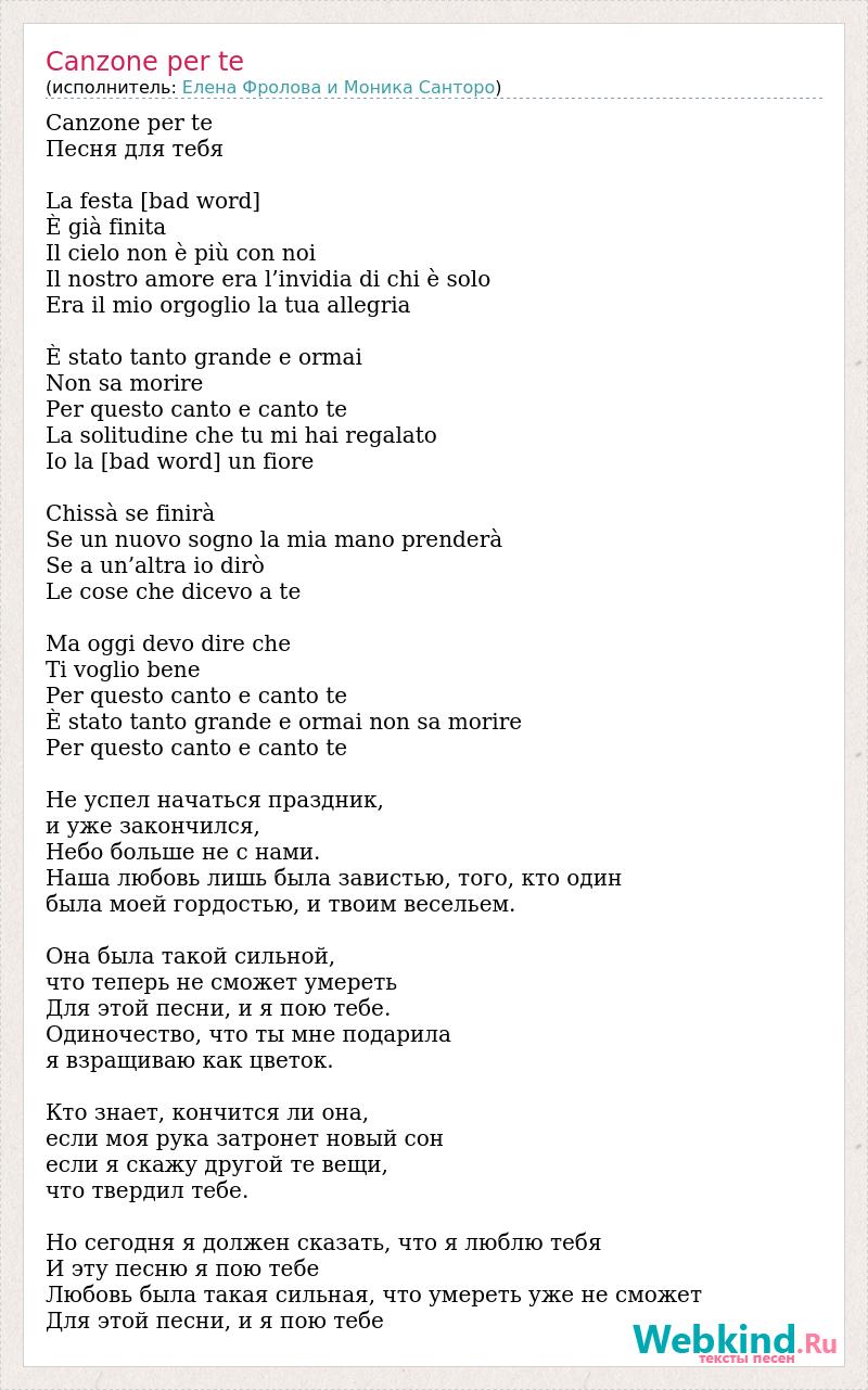 Canzone per te Песня для тебя La festa [bad word] È già finita Il cielo non è più con noi Il nostro amore era l’invidia di chi è solo Era il mio orgoglio la tua allegria È stato tanto grande e ormai Non sa morire Per questo canto e canto te La solitudine che tu mi hai regalato Io la [bad word] un fiore Chissà se finirà Se un nuovo sogno la mia mano prenderà Se a un’altra io dirò Le cose che dicevo a te Ma oggi devo dire che Ti voglio bene Per questo canto e canto te È stato tanto grande e ormai non sa morire Per questo canto e canto te Не успел начаться праздник, и уже закончился, Небо больше не с нами. Наша любовь лишь была завистью, того, кто один была моей гордостью, и твоим весельем. Она была такой сильной, что теперь не сможет умереть Для этой песни, и я пою тебе. Одиночество, что ты мне подарила я взращиваю как цветок. Кто знает, кончится ли она, если моя рука затронет новый сон если я скажу другой те вещи, что твердил тебе. Но сегодня я должен сказать, что я люблю тебя И эту песню я пою тебе Любовь была такая сильная, что умереть уже не сможет Для этой песни, и я пою тебе