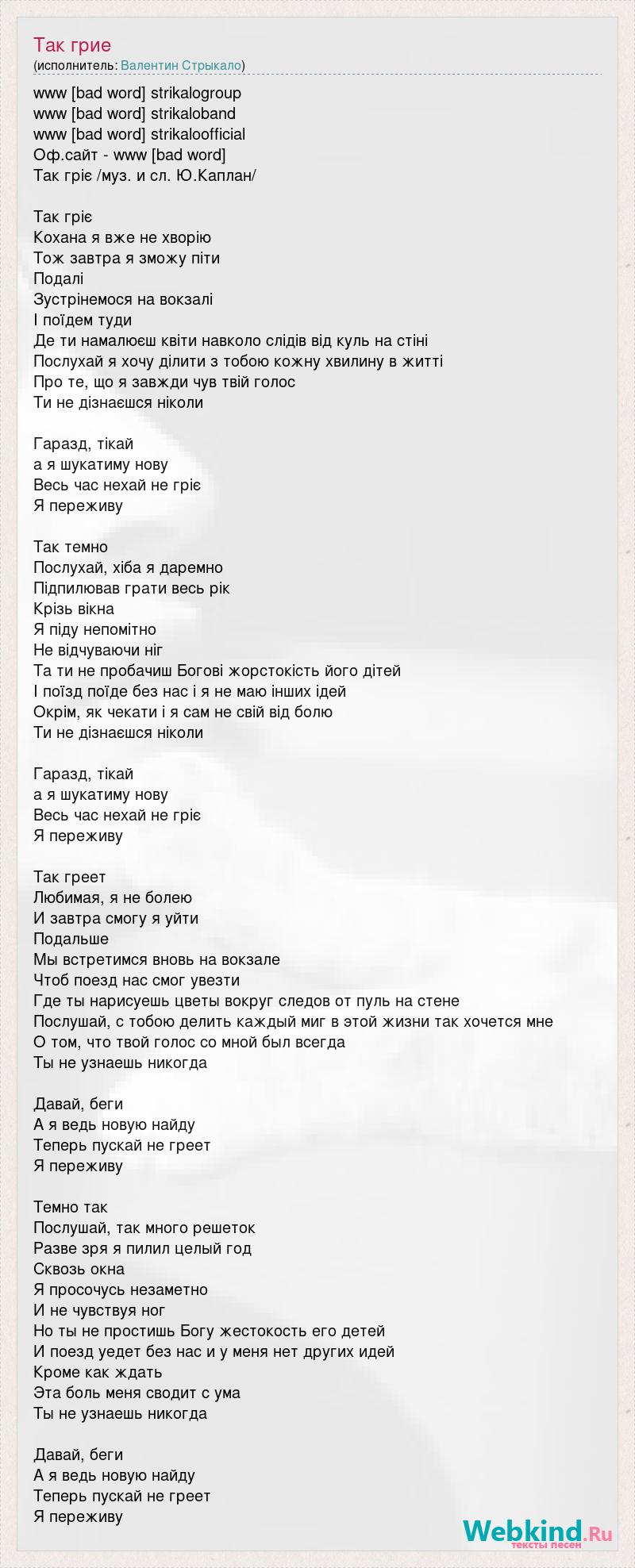 www [bad word] strikalogroup www [bad word] strikaloband www [bad word] strikaloofficial Оф.сайт - www [bad word] Так гріє /муз. и сл. Ю.Каплан/ Так гріє Кохана я вже не хворію Тож завтра я зможу піти Подалі Зустрінемося на вокзалі І поїдем туди Де ти намалюєш квіти навколо слідів від куль на стіні Послухай я хочу ділити з тобою кожну хвилину в житті Про те, що я завжди чув твій голос Ти не дізнаєшся ніколи Гаразд, тікай а я шукатиму нову Весь час нехай не гріє Я переживу Так темно Послухай, хіба я даремно Підпилював грати весь рік Крізь вікна Я піду непомітно Не відчуваючи ніг Та ти не пробачиш Богові жорстокість його дітей І поїзд поїде без нас і я не маю інших ідей Окрім, як чекати і я сам не свій від болю Ти не дізнаєшся ніколи Гаразд, тікай а я шукатиму нову Весь час нехай не гріє Я переживу Так греет Любимая, я не болею И завтра смогу я уйти Подальше Мы встретимся вновь на вокзале Чтоб поезд нас смог увезти Где ты нарисуешь цветы вокруг следов от пуль на стене Послушай, с тобою делить каждый миг в этой жизни так хочется мне О том, что твой голос со мной был всегда Ты не узнаешь никогда Давай, беги А я ведь новую найду Теперь пускай не греет Я переживу Темно так Послушай, так много решеток Разве зря я пилил целый год Сквозь окна Я просочусь незаметно И не чувствуя ног Но ты не простишь Богу жестокость его детей И поезд уедет без нас и у меня нет других идей Кроме как ждать Эта боль меня сводит с ума Ты не узнаешь никогда Давай, беги А я ведь новую найду Теперь пускай не греет Я переживу