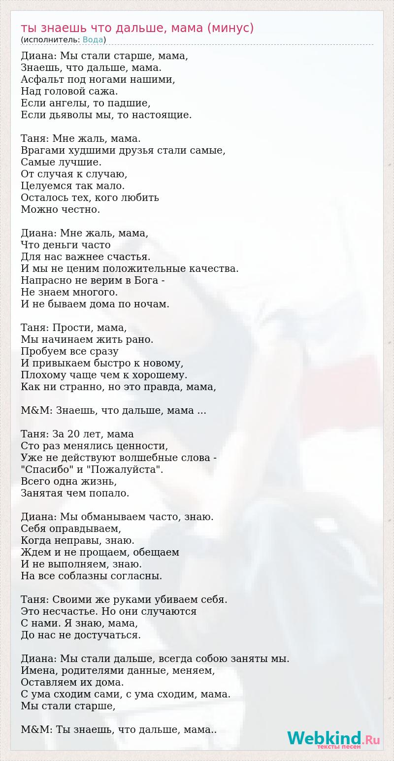 Диана: Мы стали старше, мама, Знаешь, что дальше, мама. Асфальт под ногами нашими, Над головой сажа. Если ангелы, то падшие, Если дьяволы мы, то настоящие. Таня: Мне жаль, мама. Врагами худшими друзья стали самые, Самые лучшие. От случая к случаю, Целуемся так мало. Осталось тех, кого любить Можно честно. Диана: Мне жаль, мама, Что деньги часто Для нас важнее счастья. И мы не ценим положительные качества. Напрасно не верим в Бога - Не знаем многого. И не бываем дома по ночам. Таня: Прости, мама, Мы начинаем жить рано. Пробуем все сразу И привыкаем быстро к новому, Плохому чаще чем к хорошему. Как ни странно, но это правда, мама, M&M: Знаешь, что дальше, мама ... Таня: За 20 лет, мама Сто раз менялись ценности, Уже не действуют волшебные слова - "Спасибо" и "Пожалуйста". Всего одна жизнь, Занятая чем попало. Диана: Мы обманываем часто, знаю. Себя оправдываем, Когда неправы, знаю. Ждем и не прощаем, обещаем И не выполняем, знаю. На все соблазны согласны. Таня: Своими же руками убиваем себя. Это несчастье. Но они случаются С нами. Я знаю, мама, До нас не достучаться. Диана: Мы стали дальше, всегда собою заняты мы. Имена, родителями данные, меняем, Оставляем их дома. С ума сходим сами, с ума сходим, мама. Мы стали старше, M&M: Ты знаешь, что дальше, мама..