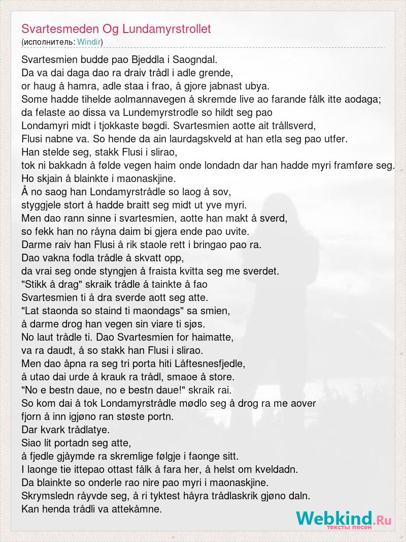 Svartesmien budde pao Bjeddla i Saogndal. Da va dai daga dao ra draiv trådl i adle grende, or haug å hamra, adle staa i frao, å gjore jabnast ubya. Some hadde tihelde aolmannavegen å skremde live ao farande fålk itte aodaga; da felaste ao dissa va Lundemyrstrodle so hildt seg pao Londamyri midt i tjokkaste bøgdi. Svartesmien aotte ait trållsverd, Flusi nabne va. So hende da ain laurdagskveld at han etla seg pao utfer. Han stelde seg, stakk Flusi i slirao, tok ni bakkadn å følde vegen haim onde londadn dar han hadde myri framføre seg. Ho skjain å blainkte i maonaskjine. Å no saog han Londamyrstrådle so laog å sov, styggjele stort å hadde braitt seg midt ut yve myri. Men dao rann sinne i svartesmien, aotte han makt å sverd, so fekk han no råyna daim bi gjera ende pao uvite. Darme raiv han Flusi å rik staole rett i bringao pao ra. Dao vakna fodla trådle å skvatt opp, da vrai seg onde styngjen å fraista kvitta seg me sverdet. "Stikk å drag" skraik trådle å tainkte å fao Svartesmien ti å dra sverde aott seg atte. "Lat staonda so staind ti maondags" sa smien, å darme drog han vegen sin viare ti sjøs. No laut trådle ti. Dao Svartesmien for haimatte, va ra daudt, å so stakk han Flusi i slirao. Men dao åpna ra seg tri porta hiti Låftesnesfjedle, å utao dai urde å krauk ra trådl, smaoe å store. "No e bestn daue, no e bestn daue!" skraik rai. So kom dai å tok Londamyrstrådle mødlo seg å drog ra me aover fjorn å inn igjøno ran støste portn. Dar kvark trådlatye. Siao lit portadn seg atte, å fjedle gjåymde ra skremlige følgje i faonge sitt. I laonge tie ittepao ottast fålk å fara her, å helst om kveldadn. Da blainkte so onderle rao nire pao myri i maonaskjine. Skrymsledn råyvde seg, å ri tyktest håyra trådlaskrik gjøno daln. Kan henda trådli va attekåmne.