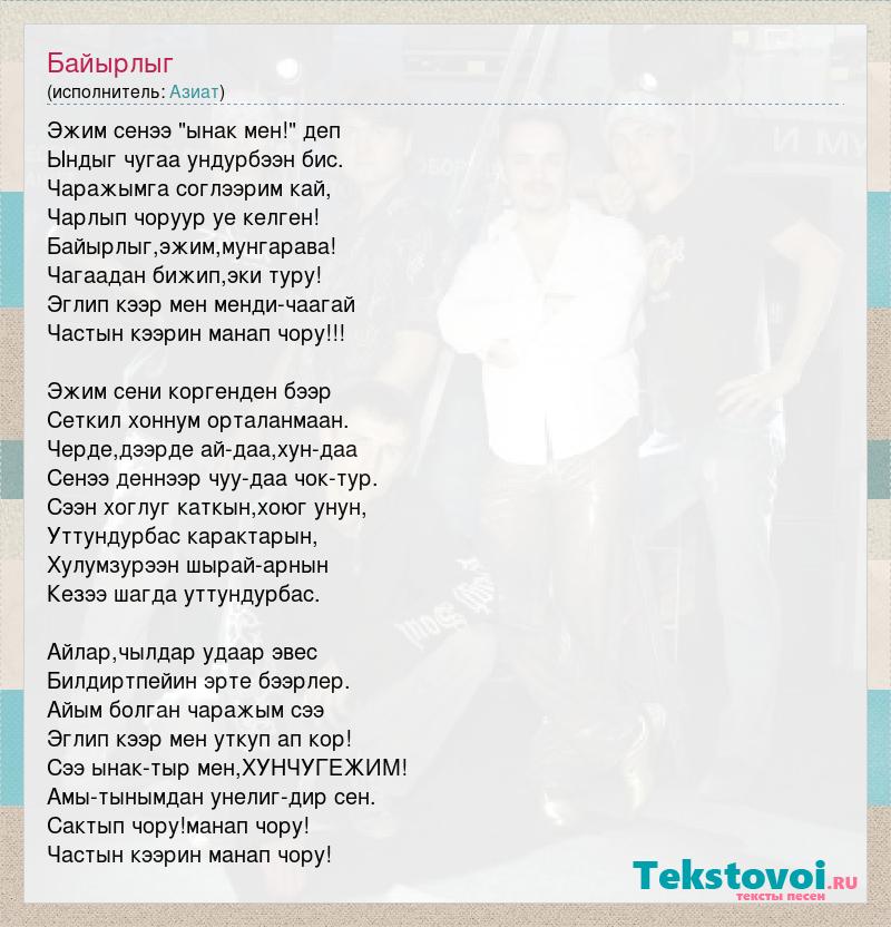 Эжим сенээ "ынак мен!" деп Ындыг чугаа ундурбээн бис. Чаражымга соглээрим кай, Чарлып чоруур уе келген! Байырлыг,эжим,мунгарава! Чагаадан бижип,эки туру! Эглип кээр мен менди-чаагай Частын кээрин манап чору!!! Эжим сени коргенден бээр Сеткил хоннум орталанмаан. Черде,дээрде ай-даа,хун-даа Сенээ деннээр чуу-даа чок-тур. Сээн хоглуг каткын,хоюг унун, Уттундурбас карактарын, Хулумзурээн шырай-арнын Кезээ шагда уттундурбас. Айлар,чылдар удаар эвес Билдиртпейин эрте бээрлер. Айым болган чаражым сээ Эглип кээр мен уткуп ап кор! Сээ ынак-тыр мен,ХУНЧУГЕЖИМ! Амы-тынымдан унелиг-дир сен. Сактып чору!манап чору! Частын кээрин манап чору!