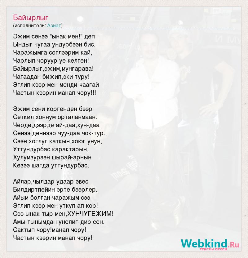 Эжим сенээ "ынак мен!" деп Ындыг чугаа ундурбээн бис. Чаражымга соглээрим кай, Чарлып чоруур уе келген! Байырлыг,эжим,мунгарава! Чагаадан бижип,эки туру! Эглип кээр мен менди-чаагай Частын кээрин манап чору!!! Эжим сени коргенден бээр Сеткил хоннум орталанмаан. Черде,дээрде ай-даа,хун-даа Сенээ деннээр чуу-даа чок-тур. Сээн хоглуг каткын,хоюг унун, Уттундурбас карактарын, Хулумзурээн шырай-арнын Кезээ шагда уттундурбас. Айлар,чылдар удаар эвес Билдиртпейин эрте бээрлер. Айым болган чаражым сээ Эглип кээр мен уткуп ап кор! Сээ ынак-тыр мен,ХУНЧУГЕЖИМ! Амы-тынымдан унелиг-дир сен. Сактып чору!манап чору! Частын кээрин манап чору!