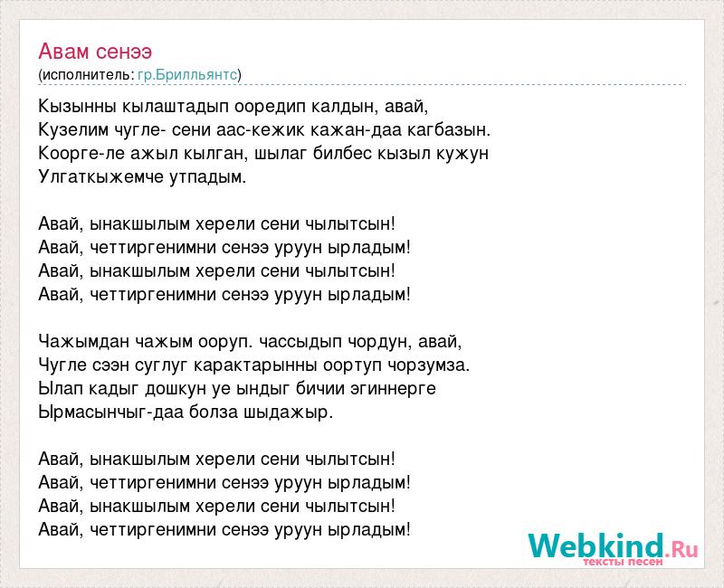 Кызынны кылаштадып ооредип калдын, авай, Кузелим чугле- сени аас-кежик кажан-даа кагбазын. Коорге-ле ажыл кылган, шылаг билбес кызыл кужун Улгаткыжемче утпадым. Авай, ынакшылым херели сени чылытсын! Авай, четтиргенимни сенээ уруун ырладым! Авай, ынакшылым херели сени чылытсын! Авай, четтиргенимни сенээ уруун ырладым! Чажымдан чажым ооруп. чассыдып чордун, авай, Чугле сээн суглуг карактарынны оортуп чорзумза. Ылап кадыг дошкун уе ындыг бичии эгиннерге Ырмасынчыг-даа болза шыдажыр. Авай, ынакшылым херели сени чылытсын! Авай, четтиргенимни сенээ уруун ырладым! Авай, ынакшылым херели сени чылытсын! Авай, четтиргенимни сенээ уруун ырладым!