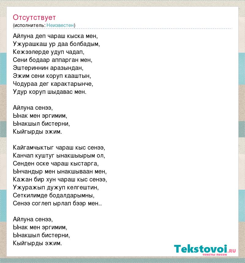 Айлуна деп чараш кыска мен, Ужурашкаш ур даа болбадым, Кежээлерде удуп чадап, Сени бодаар аппарган мен, Эштериннин аразындан, Эжим сени коруп кааштын, Чодураа дег карактарынче, Удур коруп шыдавас мен. Айлуна сенээ, Ынак мен эргимим, Ынакшыл бистерни, Кыйгырды эжим. Кайгамчыктыг чараш кыс сенээ, Канчап куштуг ынакшыырым ол, Сенден оске чараш кыстарга, Ынчандыр мен ынакшываан мен, Кажан бир хун чараш кыс сенээ, Ужуражып дужуп келгештин, Сеткилимде бодалдарымны, Сенээ соглеп ырлап бээр мен.. Айлуна сенээ, Ынак мен эргимим, Ынакшыл бистерни, Кыйгырды эжим.