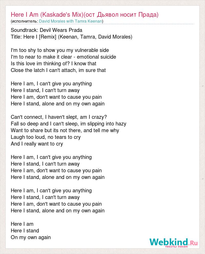 Soundtrack: Devil Wears Prada Title: Here I [Remix] (Keenan, Tamra, David Morales) I'm too shy to show you my vulnerable side I'm to near to make it clear - emotional suicide Is this love im thinking of? I know that Close the latch I can't attach, im sure that Here I am, I can't give you anything Here I stand, I can't turn away Here I am, don't want to cause you pain Here I stand, alone and on my own again Can't connect, I haven't slept, am I crazy? Fall so deep and I can't sleep, im slipping into hazy Want to share but its not there, and tell me why Laugh too loud, no tears to cry And I really want to cry Here I am, I can't give you anything Here I stand, I can't turn away Here I am, don't want to cause you pain Here I stand, alone and on my own again Here I am, I can't give you anything Here I stand, I can't turn away Here I am, don't want to cause you pain Here I stand, alone and on my own again Here I am Here I stand On my own again