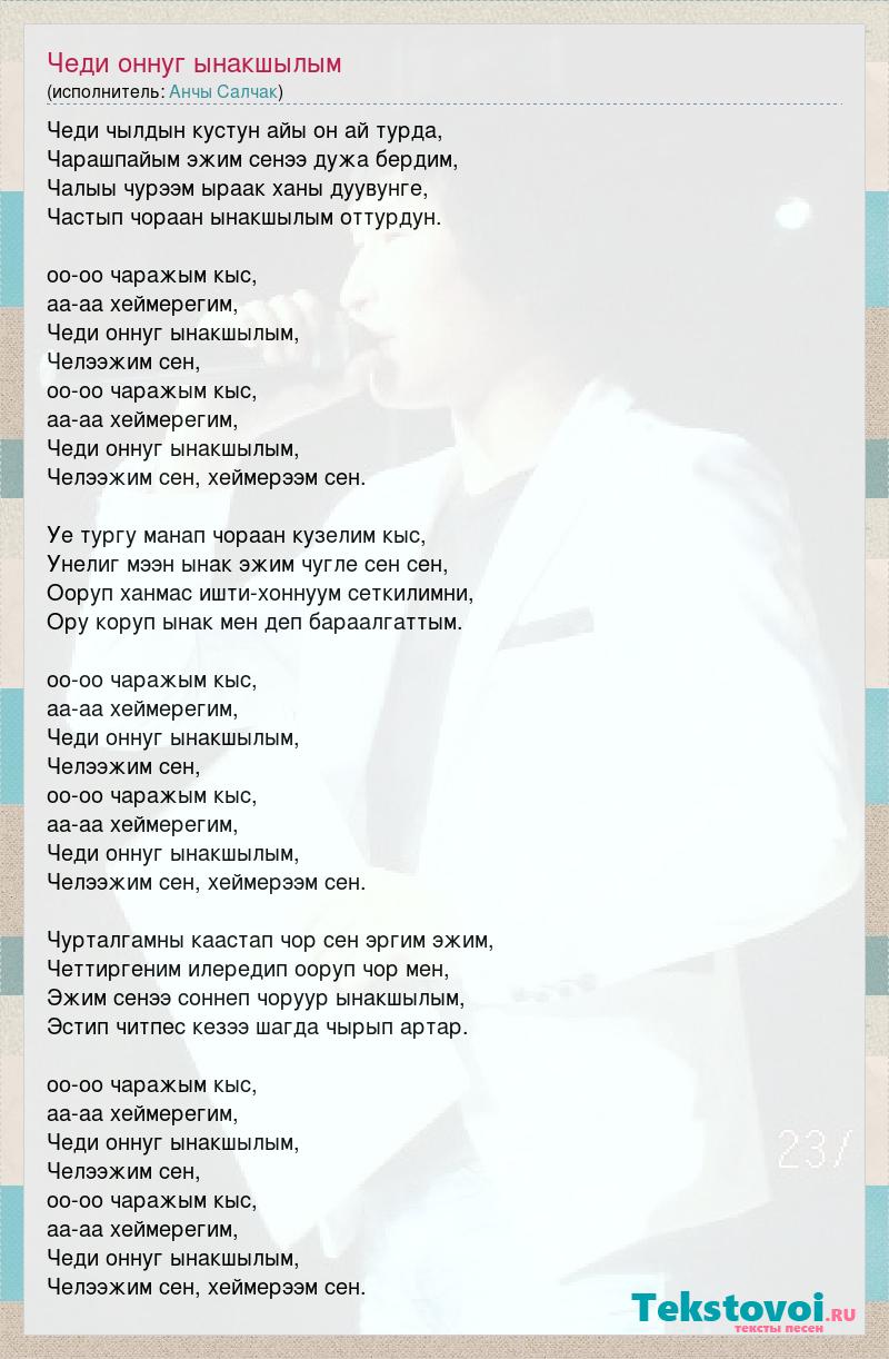 Чеди чылдын кустун айы он ай турда, Чарашпайым эжим сенээ дужа бердим, Чалыы чурээм ыраак ханы дуувунге, Частып чораан ынакшылым оттурдун. оо-оо чаражым кыс, аа-аа хеймерегим, Чеди оннуг ынакшылым, Челээжим сен, оо-оо чаражым кыс, аа-аа хеймерегим, Чеди оннуг ынакшылым, Челээжим сен, хеймерээм сен. Уе тургу манап чораан кузелим кыс, Унелиг мээн ынак эжим чугле сен сен, Ооруп ханмас ишти-хоннуум сеткилимни, Ору коруп ынак мен деп бараалгаттым. оо-оо чаражым кыс, аа-аа хеймерегим, Чеди оннуг ынакшылым, Челээжим сен, оо-оо чаражым кыс, аа-аа хеймерегим, Чеди оннуг ынакшылым, Челээжим сен, хеймерээм сен. Чурталгамны каастап чор сен эргим эжим, Четтиргеним илередип ооруп чор мен, Эжим сенээ соннеп чоруур ынакшылым, Эстип читпес кезээ шагда чырып артар. оо-оо чаражым кыс, аа-аа хеймерегим, Чеди оннуг ынакшылым, Челээжим сен, оо-оо чаражым кыс, аа-аа хеймерегим, Чеди оннуг ынакшылым, Челээжим сен, хеймерээм сен.