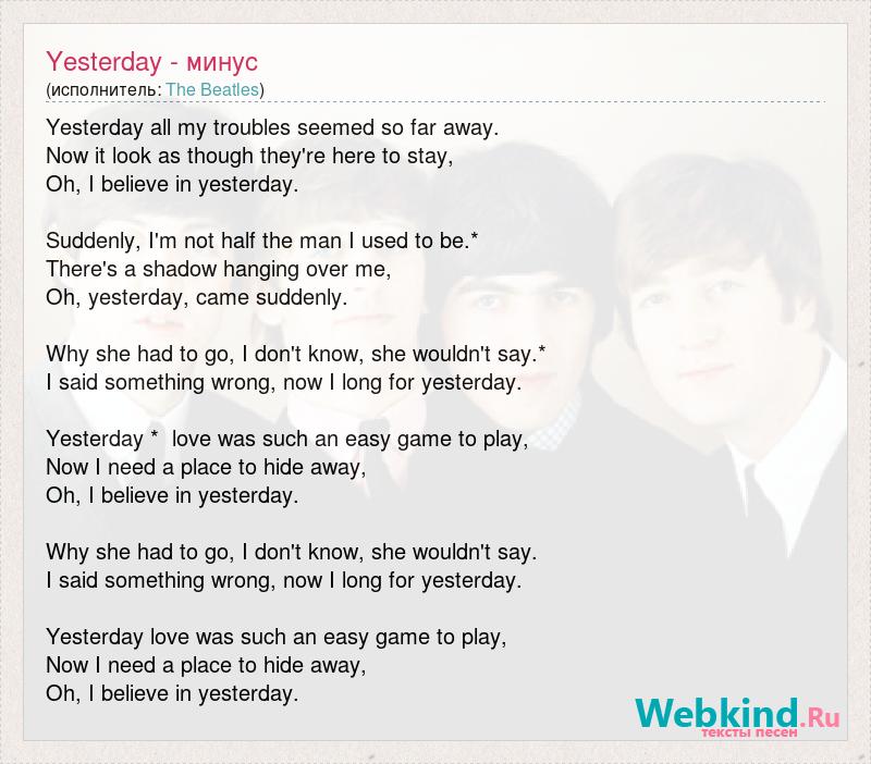 Yesterday all my troubles seemed so far away. Now it look as though they're here to stay, Oh, I believe in yesterday. Suddenly, I'm not half the man I used to be.* There's a shadow hanging over me, Oh, yesterday, came suddenly. Why she had to go, I don't know, she wouldn't say.* I said something wrong, now I long for yesterday. Yesterday * love was such an easy game to play, Now I need a place to hide away, Oh, I believe in yesterday. Why she had to go, I don't know, she wouldn't say. I said something wrong, now I long for yesterday. Yesterday love was such an easy game to play, Now I need a place to hide away, Oh, I believe in yesterday.
