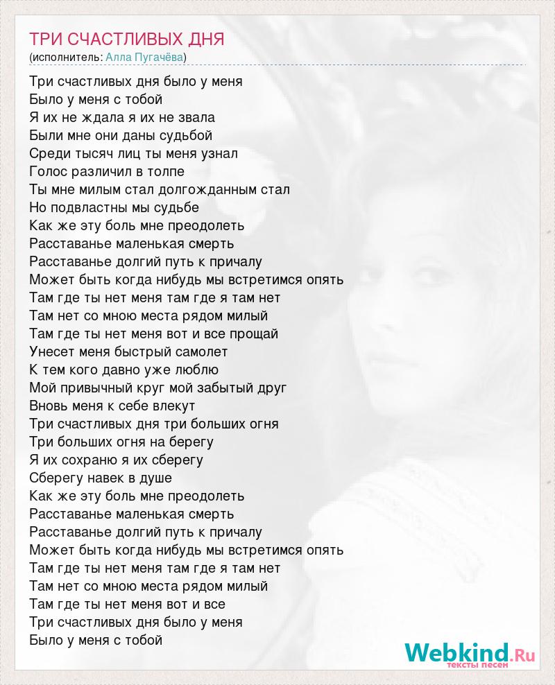 Три счастливых дня было у меня Было у меня с тобой Я их не ждала я их не звала Были мне они даны судьбой Среди тысяч лиц ты меня узнал Голос различил в толпе Ты мне милым стал долгожданным стал Но подвластны мы судьбе Как же эту боль мне преодолеть Расставанье маленькая смерть Расставанье долгий путь к причалу Может быть когда нибудь мы встретимся опять Там где ты нет меня там где я там нет Там нет со мною места рядом милый Там где ты нет меня вот и все прощай Унесет меня быстрый самолет К тем кого давно уже люблю Мой привычный круг мой забытый друг Вновь меня к себе влекут Три счастливых дня три больших огня Три больших огня на берегу Я их сохраню я их сберегу Сберегу навек в душе Как же эту боль мне преодолеть Расставанье маленькая смерть Расставанье долгий путь к причалу Может быть когда нибудь мы встретимся опять Там где ты нет меня там где я там нет Там нет со мною места рядом милый Там где ты нет меня вот и все Три счастливых дня было у меня Было у меня с тобой