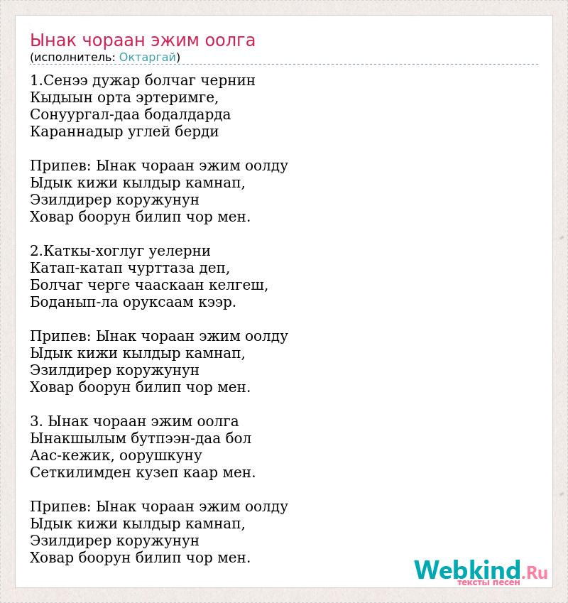 1.Сенээ дужар болчаг чернин Кыдыын орта эртеримге, Сонуургал-даа бодалдарда Караннадыр углей берди Припев: Ынак чораан эжим оолду Ыдык кижи кылдыр камнап, Эзилдирер коружунун Ховар боорун билип чор мен. 2.Каткы-хоглуг уелерни Катап-катап чурттаза деп, Болчаг черге чааскаан келгеш, Боданып-ла оруксаам кээр. Припев: Ынак чораан эжим оолду Ыдык кижи кылдыр камнап, Эзилдирер коружунун Ховар боорун билип чор мен. 3. Ынак чораан эжим оолга Ынакшылым бутпээн-даа бол Аас-кежик, оорушкуну Сеткилимден кузеп каар мен. Припев: Ынак чораан эжим оолду Ыдык кижи кылдыр камнап, Эзилдирер коружунун Ховар боорун билип чор мен.