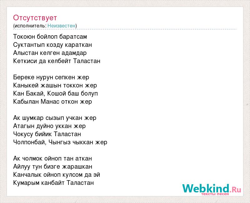 Токоюн бойлоп баратсам Суктантып козду караткан Алыстан келген адамдар Кеткиси да келбейт Таластан Береке нурун сепкен жер Каныкей жашын токкон жер Кан Бакай, Кошой баш болуп Кабылан Манас откон жер Ак шумкар сызып учкан жер Атагын дуйно уккан жер Чокусу бийик Таластан Чолпонбай, Чынгыз чыккан жер Ак чолмок ойноп тан аткан Айлуу тун бизге жарашкан Канчалык ойноп кулсом да эй Кумарым канбайт Таластан