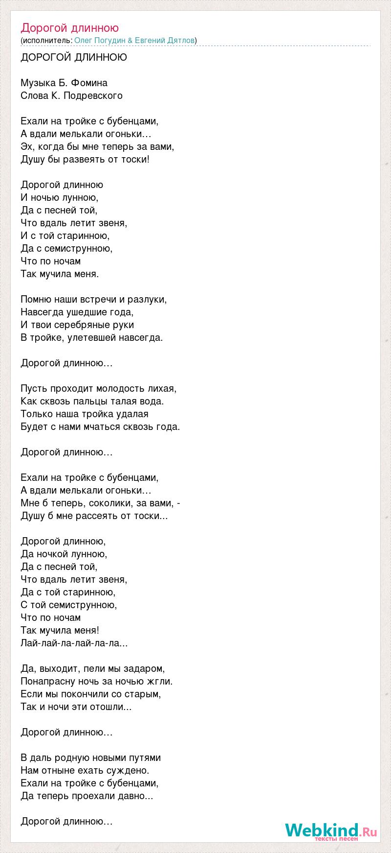 ДОРОГОЙ ДЛИННОЮ Музыка Б. Фомина Слова К. Подревского Ехали на тройке с бубенцами, А вдали мелькали огоньки… Эх, когда бы мне теперь за вами, Душу бы развеять от тоски! Дорогой длинною И ночью лунною, Да с песней той, Что вдаль летит звеня, И с той старинною, Да с семиструнною, Что по ночам Так мучила меня. Помню наши встречи и разлуки, Навсегда ушедшие года, И твои серебряные руки В тройке, улетевшей навсегда. Дорогой длинною… Пусть проходит молодость лихая, Как сквозь пальцы талая вода. Только наша тройка удалая Будет с нами мчаться сквозь года. Дорогой длинною… Ехали на тройке с бубенцами, А вдали мелькали огоньки… Мне б теперь, соколики, за вами, - Душу б мне рассеять от тоски... Дорогой длинною, Да ночкой лунною, Да с песней той, Что вдаль летит звеня, Да с той старинною, С той семиструнною, Что по ночам Так мучила меня! Лай-лай-ла-лай-ла-ла... Да, выходит, пели мы задаром, Понапрасну ночь за ночью жгли. Если мы покончили со старым, Так и ночи эти отошли... Дорогой длинною… В даль родную новыми путями Нам отныне ехать суждено. Ехали на тройке с бубенцами, Да теперь проехали давно... Дорогой длинною…