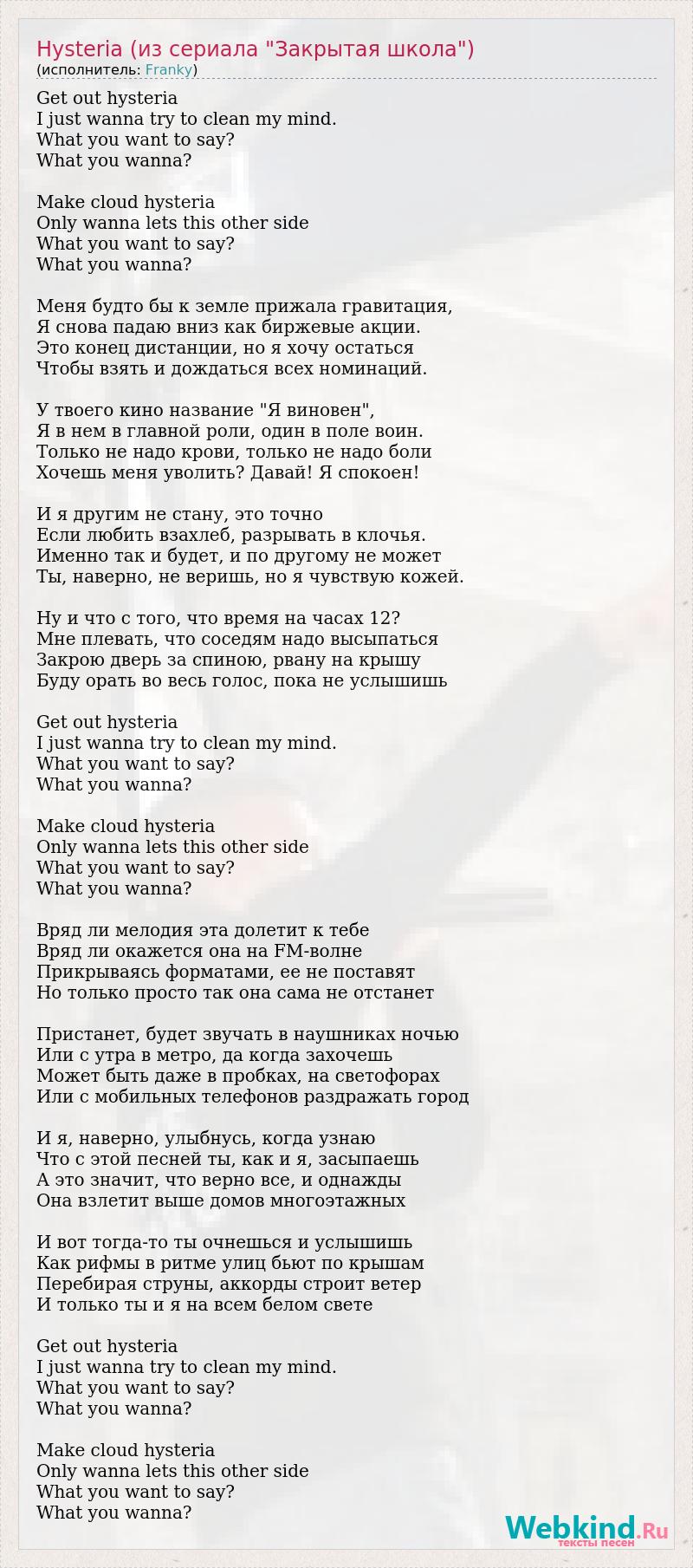 Get out hysteria I just wanna try to clean my mind. What you want to say? What you wanna? Make cloud hysteria Only wanna lets this other side What you want to say? What you wanna? Меня будто бы к земле прижала гравитация, Я снова падаю вниз как биржевые акции. Это конец дистанции, но я хочу остаться Чтобы взять и дождаться всех номинаций. У твоего кино название "Я виновен", Я в нем в главной роли, один в поле воин. Только не надо крови, только не надо боли Хочешь меня уволить? Давай! Я спокоен! И я другим не стану, это точно Если любить взахлеб, разрывать в клочья. Именно так и будет, и по другому не может Ты, наверно, не веришь, но я чувствую кожей. Ну и что с того, что время на часах 12? Мне плевать, что соседям надо высыпаться Закрою дверь за спиною, рвану на крышу Буду орать во весь голос, пока не услышишь Get out hysteria I just wanna try to clean my mind. What you want to say? What you wanna? Make cloud hysteria Only wanna lets this other side What you want to say? What you wanna? Вряд ли мелодия эта долетит к тебе Вряд ли окажется она на FM-волне Прикрываясь форматами, ее не поставят Но только просто так она сама не отстанет Пристанет, будет звучать в наушниках ночью Или с утра в метро, да когда захочешь Может быть даже в пробках, на светофорах Или с мобильных телефонов раздражать город И я, наверно, улыбнусь, когда узнаю Что с этой песней ты, как и я, засыпаешь А это значит, что верно все, и однажды Она взлетит выше домов многоэтажных И вот тогда-то ты очнешься и услышишь Как рифмы в ритме улиц бьют по крышам Перебирая струны, аккорды строит ветер И только ты и я на всем белом свете Get out hysteria I just wanna try to clean my mind. What you want to say? What you wanna? Make cloud hysteria Only wanna lets this other side What you want to say? What you wanna?