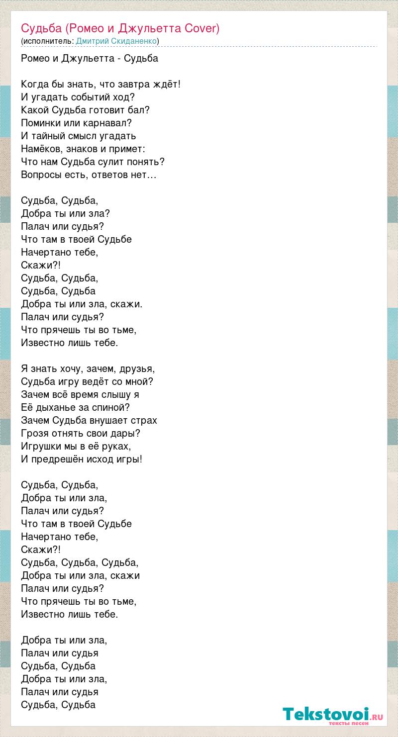 Ромео и Джульетта - Судьба Когда бы знать, что завтра ждёт! И угадать событий ход? Какой Судьба готовит бал? Поминки или карнавал? И тайный смысл угадать Намёков, знаков и примет: Что нам Судьба сулит понять? Вопросы есть, ответов нет… Судьба, Судьба, Добра ты или зла? Палач или судья? Что там в твоей Судьбе Начертано тебе, Скажи?! Судьба, Судьба, Судьба, Судьба Добра ты или зла, скажи. Палач или судья? Что прячешь ты во тьме, Известно лишь тебе. Я знать хочу, зачем, друзья, Судьба игру ведёт со мной? Зачем всё время слышу я Её дыханье за спиной? Зачем Судьба внушает страх Грозя отнять свои дары? Игрушки мы в её руках, И предрешён исход игры! Судьба, Судьба, Добра ты или зла, Палач или судья? Что там в твоей Судьбе Начертано тебе, Скажи?! Судьба, Судьба, Судьба, Добра ты или зла, скажи Палач или судья? Что прячешь ты во тьме, Известно лишь тебе. Добра ты или зла, Палач или судья Судьба, Судьба Добра ты или зла, Палач или судья Судьба, Судьба