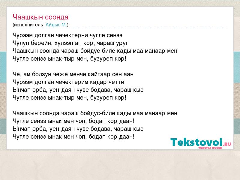 Чурээм долган чечектерни чугле сенээ Чулуп берейн, хулээп ап кор, чараш уруг Чаашкын соонда чараш бойдус-биле кады маа манаар мен Чугле сенээ ынак-тыр мен, бузуреп кор! Че, ам болзун чеже менче кайгаар сен аан Чурээм долган чечектерим кадар четти Ынчап орба, уен-даян чуве бодава, чараш кыс Чугле сенээ ынак-тыр мен, бузуреп кор! Чаашкын соонда чараш бойдус-биле кады маа манаар мен Чугле сенээ ынак мен чоп, бодап кор даан! Ынчап орба, уен-даян чуве бодава, чараш кыс Чугле сенээ ынак мен чоп, бодап кор даан!