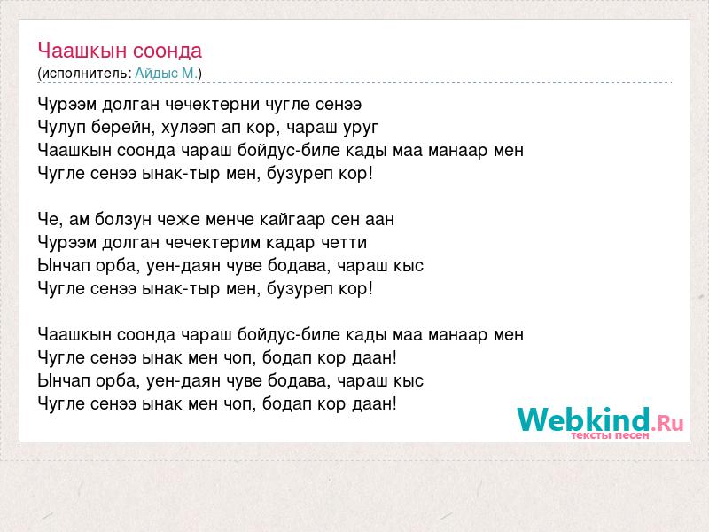 Чурээм долган чечектерни чугле сенээ Чулуп берейн, хулээп ап кор, чараш уруг Чаашкын соонда чараш бойдус-биле кады маа манаар мен Чугле сенээ ынак-тыр мен, бузуреп кор! Че, ам болзун чеже менче кайгаар сен аан Чурээм долган чечектерим кадар четти Ынчап орба, уен-даян чуве бодава, чараш кыс Чугле сенээ ынак-тыр мен, бузуреп кор! Чаашкын соонда чараш бойдус-биле кады маа манаар мен Чугле сенээ ынак мен чоп, бодап кор даан! Ынчап орба, уен-даян чуве бодава, чараш кыс Чугле сенээ ынак мен чоп, бодап кор даан!