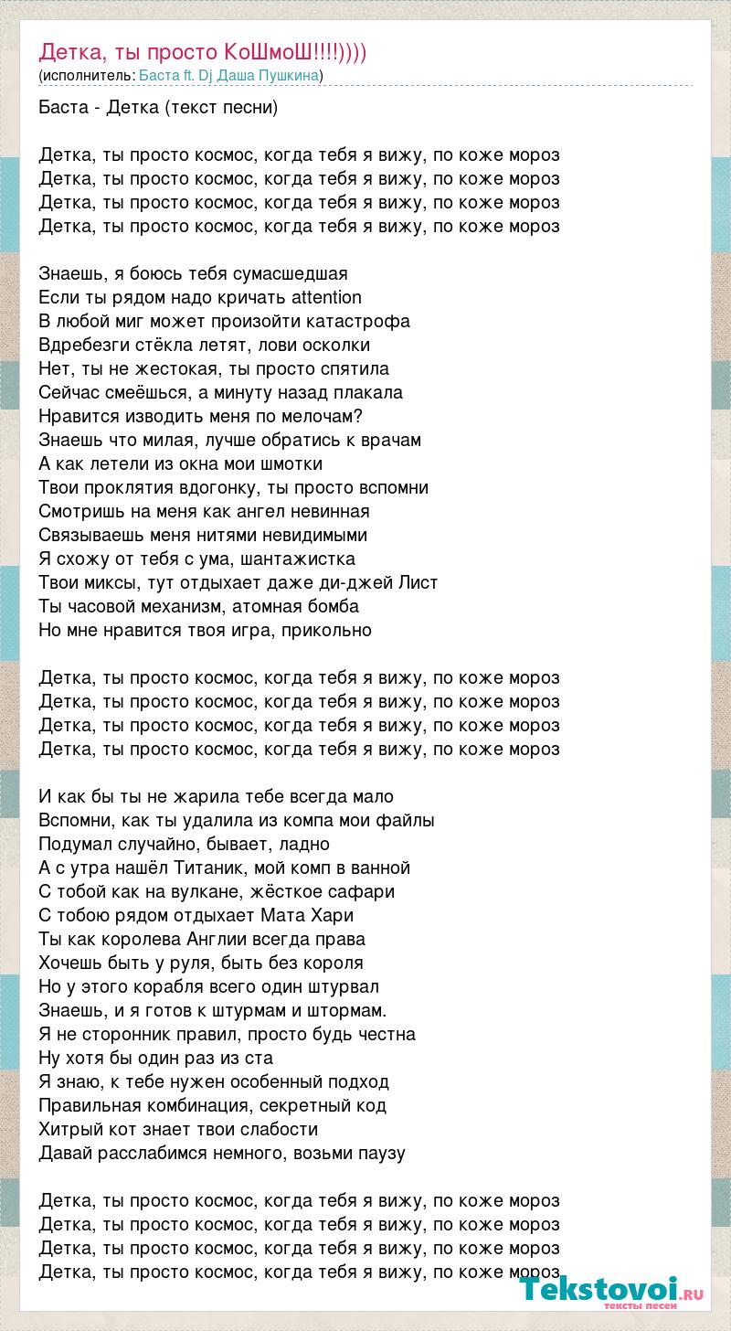 Баста - Детка (текст песни) Детка, ты просто космос, когда тебя я вижу, по коже мороз Детка, ты просто космос, когда тебя я вижу, по коже мороз Детка, ты просто космос, когда тебя я вижу, по коже мороз Детка, ты просто космос, когда тебя я вижу, по коже мороз Знаешь, я боюсь тебя сумасшедшая Если ты рядом надо кричать attention В любой миг может произойти катастрофа Вдребезги стёкла летят, лови осколки Нет, ты не жестокая, ты просто спятила Сейчас смеёшься, а минуту назад плакала Нравится изводить меня по мелочам? Знаешь что милая, лучше обратись к врачам А как летели из окна мои шмотки Твои проклятия вдогонку, ты просто вспомни Смотришь на меня как ангел невинная Связываешь меня нитями невидимыми Я схожу от тебя с ума, шантажистка Твои миксы, тут отдыхает даже ди-джей Лист Ты часовой механизм, атомная бомба Но мне нравится твоя игра, прикольно Детка, ты просто космос, когда тебя я вижу, по коже мороз Детка, ты просто космос, когда тебя я вижу, по коже мороз Детка, ты просто космос, когда тебя я вижу, по коже мороз Детка, ты просто космос, когда тебя я вижу, по коже мороз И как бы ты не жарила тебе всегда мало Вспомни, как ты удалила из компа мои файлы Подумал случайно, бывает, ладно А с утра нашёл Титаник, мой комп в ванной С тобой как на вулкане, жёсткое сафари С тобою рядом отдыхает Мата Хари Ты как королева Англии всегда права Хочешь быть у руля, быть без короля Но у этого корабля всего один штурвал Знаешь, и я готов к штурмам и штормам. Я не сторонник правил, просто будь честна Ну хотя бы один раз из ста Я знаю, к тебе нужен особенный подход Правильная комбинация, секретный код Хитрый кот знает твои слабости Давай расслабимся немного, возьми паузу Детка, ты просто космос, когда тебя я вижу, по коже мороз Детка, ты просто космос, когда тебя я вижу, по коже мороз Детка, ты просто космос, когда тебя я вижу, по коже мороз Детка, ты просто космос, когда тебя я вижу, по коже мороз