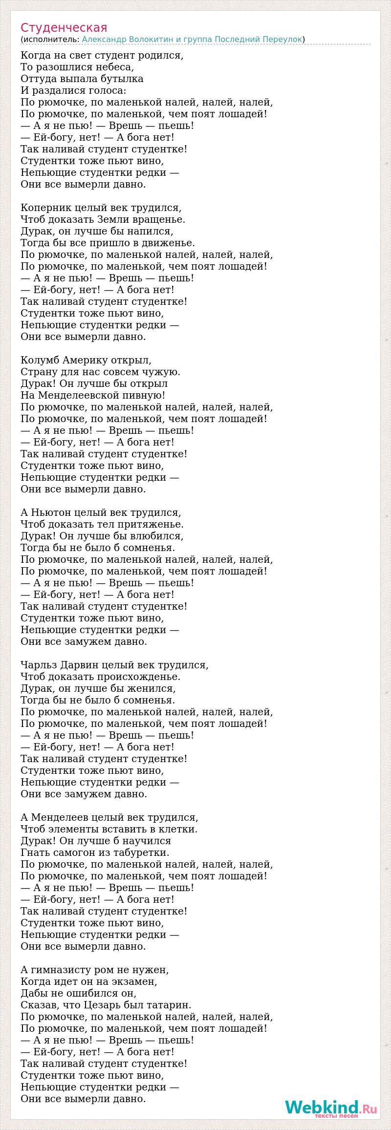Когда на свет студент родился, То разошлися небеса, Оттуда выпала бутылка И раздалися голоса: По рюмочке, по маленькой налей, налей, налей, По рюмочке, по маленькой, чем поят лошадей! — А я не пью! — Врешь — пьешь! — Eй-богу, нет! — А бога нет! Так наливай студент студентке! Студентки тоже пьют вино, Непьющие студентки редки — Они все вымерли давно. Коперник целый век трудился, Чтоб доказать Земли вращенье. Дурак, он лучше бы напился, Тогда бы все пришло в движенье. По рюмочке, по маленькой налей, налей, налей, По рюмочке, по маленькой, чем поят лошадей! — А я не пью! — Врешь — пьешь! — Eй-богу, нет! — А бога нет! Так наливай студент студентке! Студентки тоже пьют вино, Непьющие студентки редки — Они все вымерли давно. Колумб Америку открыл, Страну для нас совсем чужую. Дурак! Он лучше бы открыл На Менделеевской пивную! По рюмочке, по маленькой налей, налей, налей, По рюмочке, по маленькой, чем поят лошадей! — А я не пью! — Врешь — пьешь! — Eй-богу, нет! — А бога нет! Так наливай студент студентке! Студентки тоже пьют вино, Непьющие студентки редки — Они все вымерли давно. А Ньютон целый век трудился, Чтоб доказать тел притяженье. Дурак! Он лучше бы влюбился, Тогда бы не было б сомненья. По рюмочке, по маленькой налей, налей, налей, По рюмочке, по маленькой, чем поят лошадей! — А я не пью! — Врешь — пьешь! — Eй-богу, нет! — А бога нет! Так наливай студент студентке! Студентки тоже пьют вино, Непьющие студентки редки — Они все замужем давно. Чарльз Дарвин целый век трудился, Чтоб доказать происхожденье. Дурак, он лучше бы женился, Тогда бы не было б сомненья. По рюмочке, по маленькой налей, налей, налей, По рюмочке, по маленькой, чем поят лошадей! — А я не пью! — Врешь — пьешь! — Eй-богу, нет! — А бога нет! Так наливай студент студентке! Студентки тоже пьют вино, Непьющие студентки редки — Они все замужем давно. А Менделеев целый век трудился, Чтоб элементы вставить в клетки. Дурак! Он лучше б научился Гнать самогон из табуретки. По рюмочке, по маленькой налей, налей, налей, По рюмочке, по маленькой, чем поят лошадей! — А я не пью! — Врешь — пьешь! — Eй-богу, нет! — А бога нет! Так наливай студент студентке! Студентки тоже пьют вино, Непьющие студентки редки — Они все вымерли давно. А гимназисту ром не нужен, Когда идет он на экзамен, Дабы не ошибился он, Сказав, что Цезарь был татарин. По рюмочке, по маленькой налей, налей, налей, По рюмочке, по маленькой, чем поят лошадей! — А я не пью! — Врешь — пьешь! — Eй-богу, нет! — А бога нет! Так наливай студент студентке! Студентки тоже пьют вино, Непьющие студентки редки — Они все вымерли давно.