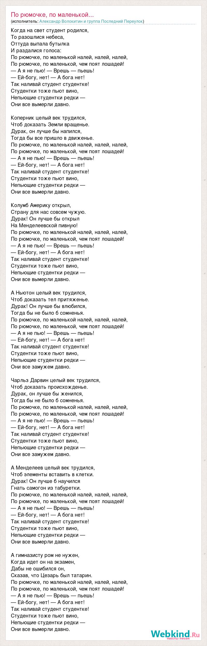 Когда на свет студент родился, То разошлися небеса, Оттуда выпала бутылка И раздалися голоса: По рюмочке, по маленькой налей, налей, налей, По рюмочке, по маленькой, чем поят лошадей! — А я не пью! — Врешь — пьешь! — Eй-богу, нет! — А бога нет! Так наливай студент студентке! Студентки тоже пьют вино, Непьющие студентки редки — Они все вымерли давно. Коперник целый век трудился, Чтоб доказать Земли вращенье. Дурак, он лучше бы напился, Тогда бы все пришло в движенье. По рюмочке, по маленькой налей, налей, налей, По рюмочке, по маленькой, чем поят лошадей! — А я не пью! — Врешь — пьешь! — Eй-богу, нет! — А бога нет! Так наливай студент студентке! Студентки тоже пьют вино, Непьющие студентки редки — Они все вымерли давно. Колумб Америку открыл, Страну для нас совсем чужую. Дурак! Он лучше бы открыл На Менделеевской пивную! По рюмочке, по маленькой налей, налей, налей, По рюмочке, по маленькой, чем поят лошадей! — А я не пью! — Врешь — пьешь! — Eй-богу, нет! — А бога нет! Так наливай студент студентке! Студентки тоже пьют вино, Непьющие студентки редки — Они все вымерли давно. А Ньютон целый век трудился, Чтоб доказать тел притяженье. Дурак! Он лучше бы влюбился, Тогда бы не было б сомненья. По рюмочке, по маленькой налей, налей, налей, По рюмочке, по маленькой, чем поят лошадей! — А я не пью! — Врешь — пьешь! — Eй-богу, нет! — А бога нет! Так наливай студент студентке! Студентки тоже пьют вино, Непьющие студентки редки — Они все замужем давно. Чарльз Дарвин целый век трудился, Чтоб доказать происхожденье. Дурак, он лучше бы женился, Тогда бы не было б сомненья. По рюмочке, по маленькой налей, налей, налей, По рюмочке, по маленькой, чем поят лошадей! — А я не пью! — Врешь — пьешь! — Eй-богу, нет! — А бога нет! Так наливай студент студентке! Студентки тоже пьют вино, Непьющие студентки редки — Они все замужем давно. А Менделеев целый век трудился, Чтоб элементы вставить в клетки. Дурак! Он лучше б научился Гнать самогон из табуретки. По рюмочке, по маленькой налей, налей, налей, По рюмочке, по маленькой, чем поят лошадей! — А я не пью! — Врешь — пьешь! — Eй-богу, нет! — А бога нет! Так наливай студент студентке! Студентки тоже пьют вино, Непьющие студентки редки — Они все вымерли давно. А гимназисту ром не нужен, Когда идет он на экзамен, Дабы не ошибился он, Сказав, что Цезарь был татарин. По рюмочке, по маленькой налей, налей, налей, По рюмочке, по маленькой, чем поят лошадей! — А я не пью! — Врешь — пьешь! — Eй-богу, нет! — А бога нет! Так наливай студент студентке! Студентки тоже пьют вино, Непьющие студентки редки — Они все вымерли давно.