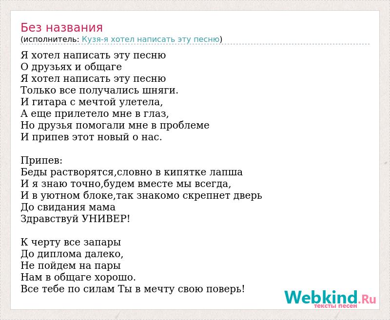 Я хотел написать эту песню О друзьях и общаге Я хотел написать эту песню Только все получались шняги. И гитара с мечтой улетела, А еще прилетело мне в глаз, Но друзья помогали мне в проблеме И припев этот новый о нас. Припев: Беды растворятся,словно в кипятке лапша И я знаю точно,будем вместе мы всегда, И в уютном блоке,так знакомо скрепнет дверь До свидания мама Здравствуй УНИВЕР! К черту все запары До диплома далеко, Не пойдем на пары Нам в общаге хорошо. Все тебе по силам Ты в мечту свою поверь!