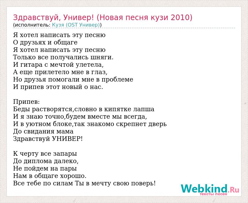 Я хотел написать эту песню О друзьях и общаге Я хотел написать эту песню Только все получались шняги. И гитара с мечтой улетела, А еще прилетело мне в глаз, Но друзья помогали мне в проблеме И припев этот новый о нас. Припев: Беды растворятся,словно в кипятке лапша И я знаю точно,будем вместе мы всегда, И в уютном блоке,так знакомо скрепнет дверь До свидания мама Здравствуй УНИВЕР! К черту все запары До диплома далеко, Не пойдем на пары Нам в общаге хорошо. Все тебе по силам Ты в мечту свою поверь!