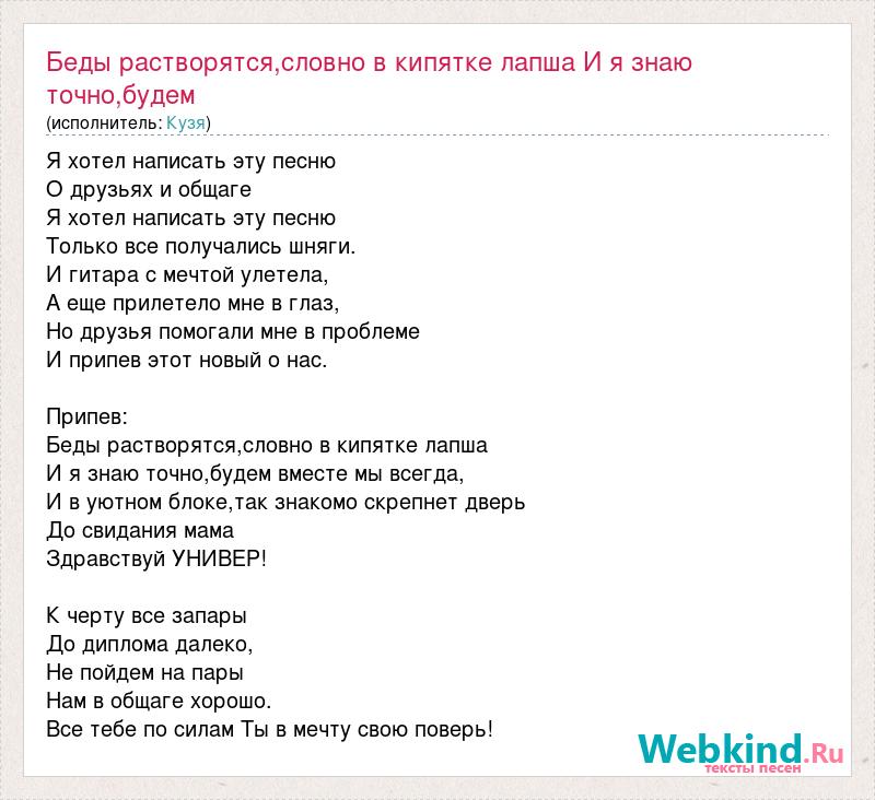 Беды растворятся,словно в кипятке лапша И я знаю точно,будем вместе мы вс