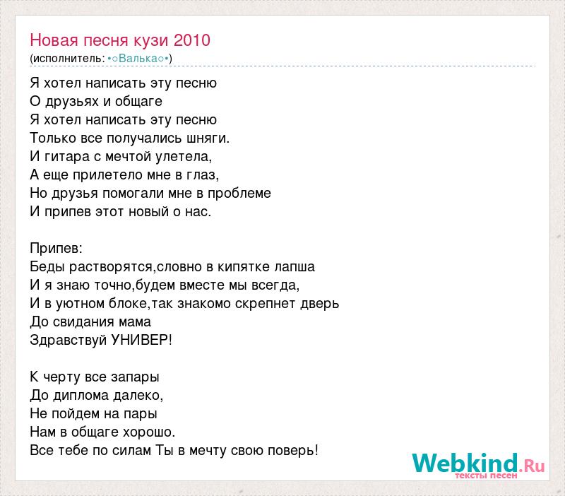 Я хотел написать эту песню О друзьях и общаге Я хотел написать эту песню Только все получались шняги. И гитара с мечтой улетела, А еще прилетело мне в глаз, Но друзья помогали мне в проблеме И припев этот новый о нас. Припев: Беды растворятся,словно в кипятке лапша И я знаю точно,будем вместе мы всегда, И в уютном блоке,так знакомо скрепнет дверь До свидания мама Здравствуй УНИВЕР! К черту все запары До диплома далеко, Не пойдем на пары Нам в общаге хорошо. Все тебе по силам Ты в мечту свою поверь!