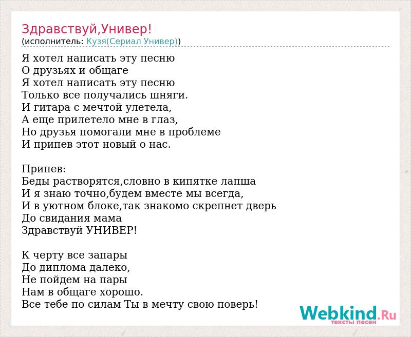 Я хотел написать эту песню О друзьях и общаге Я хотел написать эту песню Только все получались шняги. И гитара с мечтой улетела, А еще прилетело мне в глаз, Но друзья помогали мне в проблеме И припев этот новый о нас. Припев: Беды растворятся,словно в кипятке лапша И я знаю точно,будем вместе мы всегда, И в уютном блоке,так знакомо скрепнет дверь До свидания мама Здравствуй УНИВЕР! К черту все запары До диплома далеко, Не пойдем на пары Нам в общаге хорошо. Все тебе по силам Ты в мечту свою поверь!