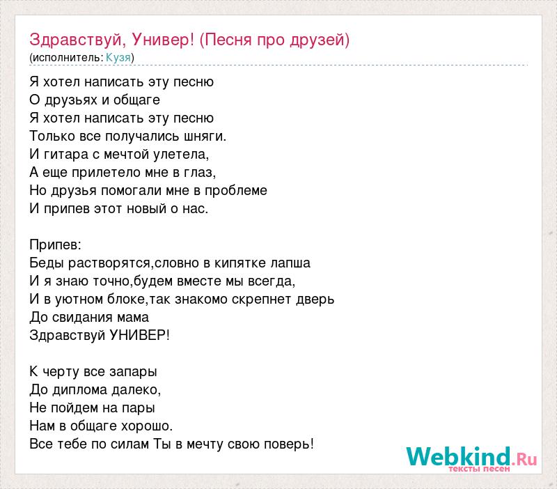 Я хотел написать эту песню О друзьях и общаге Я хотел написать эту песню Только все получались шняги. И гитара с мечтой улетела, А еще прилетело мне в глаз, Но друзья помогали мне в проблеме И припев этот новый о нас. Припев: Беды растворятся,словно в кипятке лапша И я знаю точно,будем вместе мы всегда, И в уютном блоке,так знакомо скрепнет дверь До свидания мама Здравствуй УНИВЕР! К черту все запары До диплома далеко, Не пойдем на пары Нам в общаге хорошо. Все тебе по силам Ты в мечту свою поверь!
