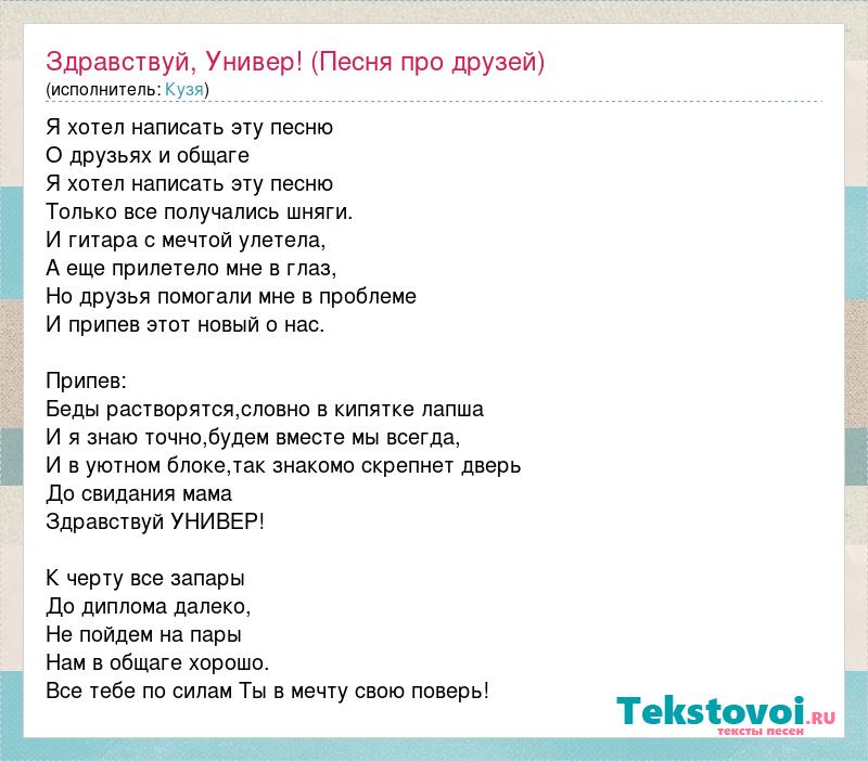 Я хотел написать эту песню О друзьях и общаге Я хотел написать эту песню Только все получались шняги. И гитара с мечтой улетела, А еще прилетело мне в глаз, Но друзья помогали мне в проблеме И припев этот новый о нас. Припев: Беды растворятся,словно в кипятке лапша И я знаю точно,будем вместе мы всегда, И в уютном блоке,так знакомо скрепнет дверь До свидания мама Здравствуй УНИВЕР! К черту все запары До диплома далеко, Не пойдем на пары Нам в общаге хорошо. Все тебе по силам Ты в мечту свою поверь!