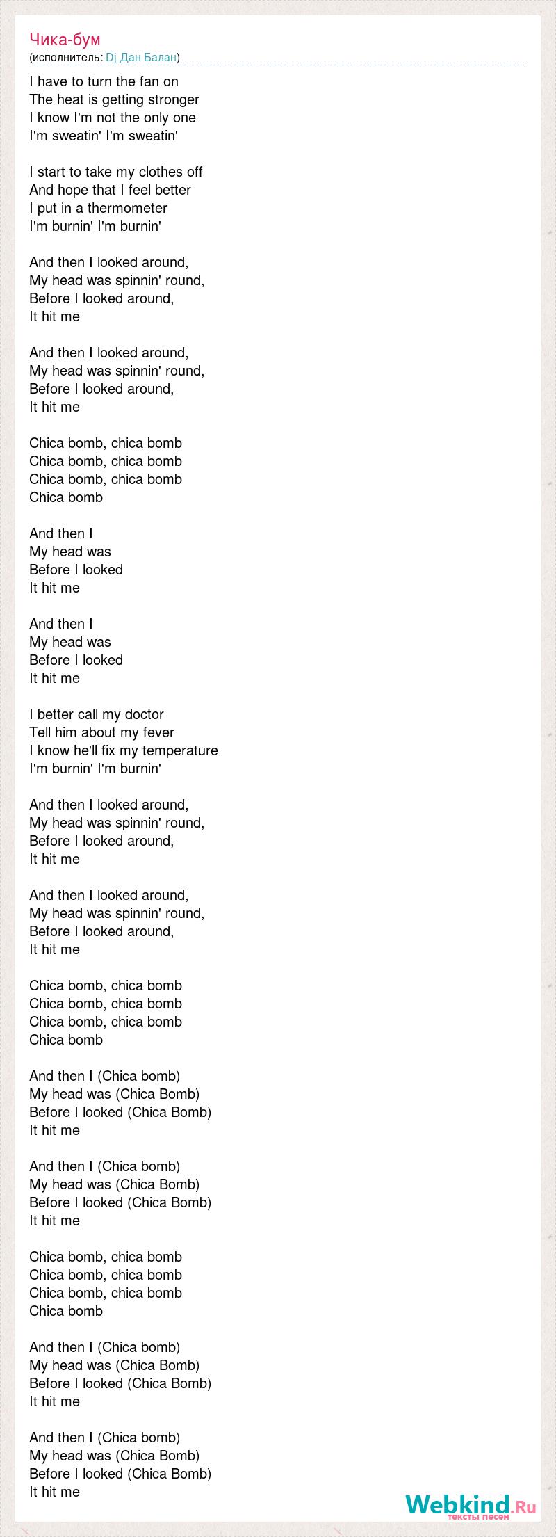 I have to turn the fan on The heat is getting stronger I know I'm not the only one I'm sweatin' I'm sweatin' I start to take my clothes off And hope that I feel better I put in a thermometer I'm burnin' I'm burnin' And then I looked around, My head was spinnin' round, Before I looked around, It hit me And then I looked around, My head was spinnin' round, Before I looked around, It hit me Chica bomb, сhica bomb Chica bomb, сhica bomb Chica bomb, сhica bomb Chica bomb And then I My head was Before I looked It hit me And then I My head was Before I looked It hit me I better call my doctor Tell him about my fever I know he'll fix my temperature I'm burnin' I'm burnin' And then I looked around, My head was spinnin' round, Before I looked around, It hit me And then I looked around, My head was spinnin' round, Before I looked around, It hit me Chica bomb, сhica bomb Chica bomb, сhica bomb Chica bomb, сhica bomb Chica bomb And then I (Chica bomb) My head was (Chica Bomb) Before I looked (Chica Bomb) It hit me And then I (Chica bomb) My head was (Chica Bomb) Before I looked (Chica Bomb) It hit me Chica bomb, сhica bomb Chica bomb, сhica bomb Chica bomb, сhica bomb Chica bomb And then I (Chica bomb) My head was (Chica Bomb) Before I looked (Chica Bomb) It hit me And then I (Chica bomb) My head was (Chica Bomb) Before I looked (Chica Bomb) It hit me