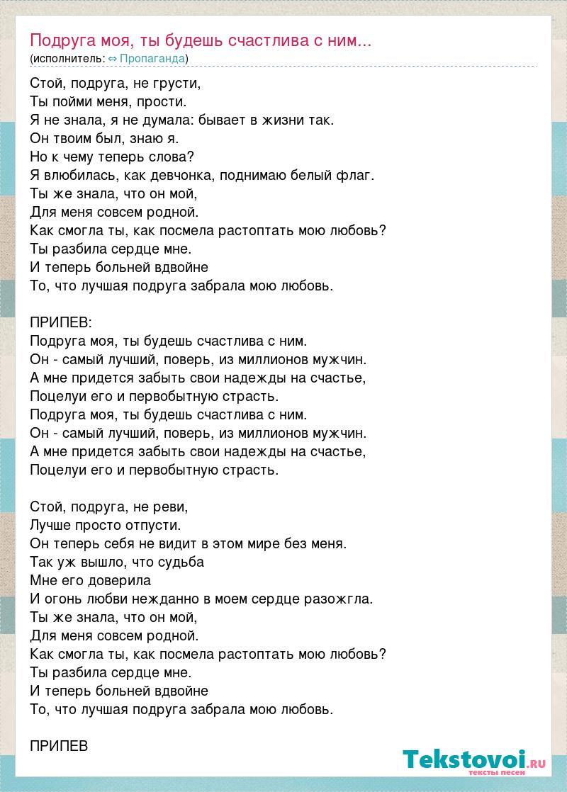 Стой, подруга, не грусти, Ты пойми меня, прости. Я не знала, я не думала: бывает в жизни так. Он твоим был, знаю я. Но к чему теперь слова? Я влюбилась, как девчонка, поднимаю белый флаг. Ты же знала, что он мой, Для меня совсем родной. Как смогла ты, как посмела растоптать мою любовь? Ты разбила сердце мне. И теперь больней вдвойне То, что лучшая подруга забрала мою любовь. ПРИПЕВ: Подруга моя, ты будешь счастлива с ним. Он - самый лучший, поверь, из миллионов мужчин. А мне придется забыть свои надежды на счастье, Поцелуи его и первобытную страсть. Подруга моя, ты будешь счастлива с ним. Он - самый лучший, поверь, из миллионов мужчин. А мне придется забыть свои надежды на счастье, Поцелуи его и первобытную страсть. Стой, подруга, не реви, Лучше просто отпусти. Он теперь себя не видит в этом мире без меня. Так уж вышло, что судьба Мне его доверила И огонь любви нежданно в моем сердце разожгла. Ты же знала, что он мой, Для меня совсем родной. Как смогла ты, как посмела растоптать мою любовь? Ты разбила сердце мне. И теперь больней вдвойне То, что лучшая подруга забрала мою любовь. ПРИПЕВ