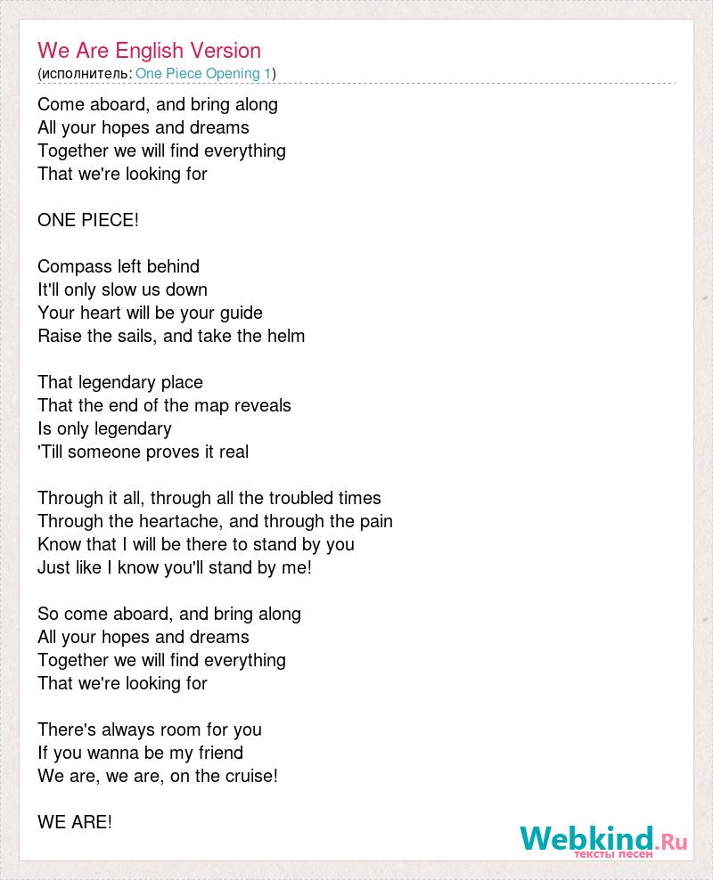Come aboard, and bring along All your hopes and dreams Together we will find everything That we're looking for ONE PIECE! Compass left behind It'll only slow us down Your heart will be your guide Raise the sails, and take the helm That legendary place That the end of the map reveals Is only legendary 'Till someone proves it real Through it all, through all the troubled times Through the heartache, and through the pain Know that I will be there to stand by you Just like I know you'll stand by me! So come aboard, and bring along All your hopes and dreams Together we will find everything That we're looking for There's always room for you If you wanna be my friend We are, we are, on the cruise! WE ARE!