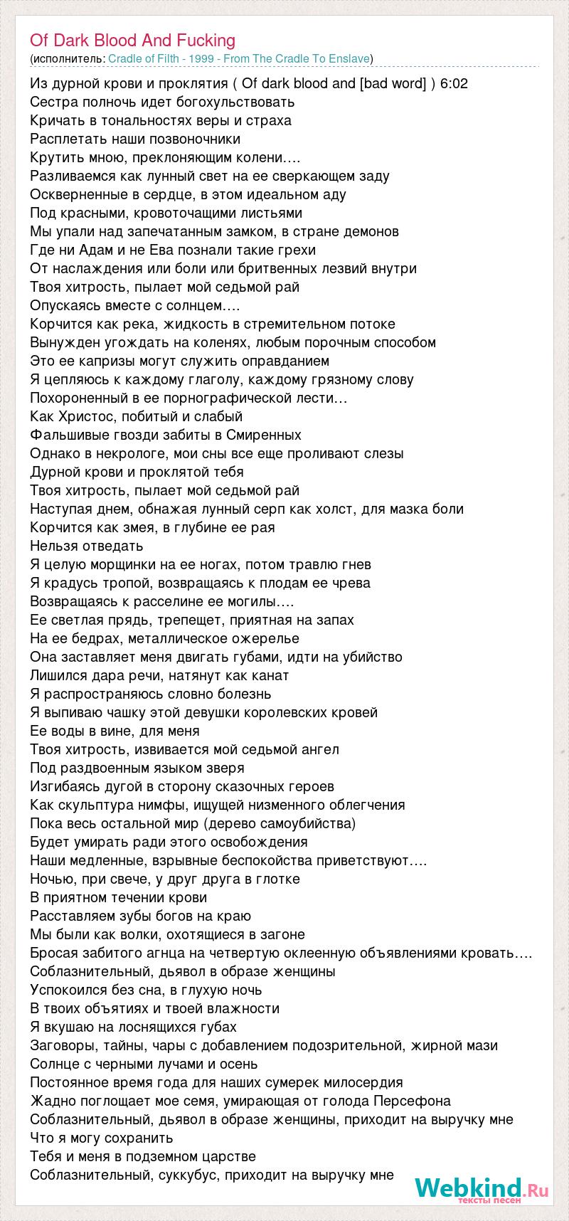 Из дурной крови и проклятия ( Of dark blood and [bad word] ) 6:02 Сестра полночь идет богохульствовать Кричать в тональностях веры и страха Расплетать наши позвоночники Крутить мною, преклоняющим колени…. Разливаемся как лунный свет на ее сверкающем заду Оскверненные в сердце, в этом идеальном аду Под красными, кровоточащими листьями Мы упали над запечатанным замком, в стране демонов Где ни Адам и не Ева познали такие грехи От наслаждения или боли или бритвенных лезвий внутри Твоя хитрость, пылает мой седьмой рай Опускаясь вместе с солнцем…. Корчится как река, жидкость в стремительном потоке Вынужден угождать на коленях, любым порочным способом Это ее капризы могут служить оправданием Я цепляюсь к каждому глаголу, каждому грязному слову Похороненный в ее порнографической лести… Как Христос, побитый и слабый Фальшивые гвозди забиты в Смиренных Однако в некрологе, мои сны все еще проливают слезы Дурной крови и проклятой тебя Твоя хитрость, пылает мой седьмой рай Наступая днем, обнажая лунный серп как холст, для мазка боли Корчится как змея, в глубине ее рая Нельзя отведать Я целую морщинки на ее ногах, потом травлю гнев Я крадусь тропой, возвращаясь к плодам ее чрева Возвращаясь к расселине ее могилы…. Ее светлая прядь, трепещет, приятная на запах На ее бедрах, металлическое ожерелье Она заставляет меня двигать губами, идти на убийство Лишился дара речи, натянут как канат Я распространяюсь словно болезнь Я выпиваю чашку этой девушки королевских кровей Ее воды в вине, для меня Твоя хитрость, извивается мой седьмой ангел Под раздвоенным языком зверя Изгибаясь дугой в сторону сказочных героев Как скульптура нимфы, ищущей низменного облегчения Пока весь остальной мир (дерево самоубийства) Будет умирать ради этого освобождения Наши медленные, взрывные беспокойства приветствуют…. Ночью, при свече, у друг друга в глотке В приятном течении крови Расставляем зубы богов на краю Мы были как волки, охотящиеся в загоне Бросая забитого агнца на четвертую оклеенную объявлениями кровать…. Соблазнительный, дьявол в образе женщины Успокоился без сна, в глухую ночь В твоих объятиях и твоей влажности Я вкушаю на лоснящихся губах Заговоры, тайны, чары с добавлением подозрительной, жирной мази Солнце с черными лучами и осень Постоянное время года для наших сумерек милосердия Жадно поглощает мое семя, умирающая от голода Персефона Соблазнительный, дьявол в образе женщины, приходит на выручку мне Что я могу сохранить Тебя и меня в подземном царстве Соблазнительный, суккубус, приходит на выручку мне