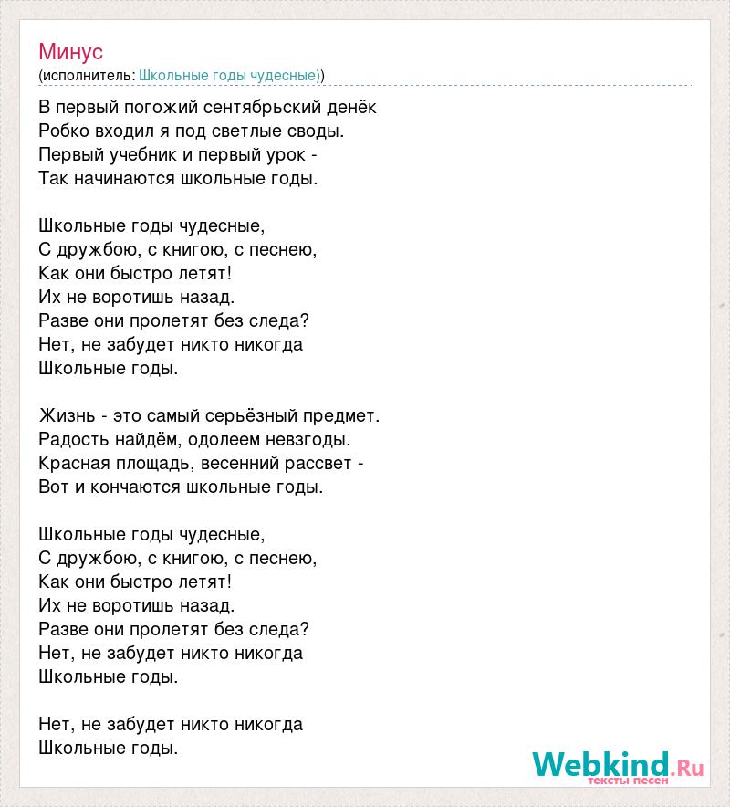 В первый погожий сентябрьский денёк Робко входил я под светлые своды. Первый учебник и первый урок - Так начинаются школьные годы. Школьные годы чудесные, С дружбою, с книгою, с песнею, Как они быстро летят! Их не воротишь назад. Разве они пролетят без следа? Нет, не забудет никто никогда Школьные годы. Жизнь - это самый серьёзный предмет. Радость найдём, одолеем невзгоды. Красная площадь, весенний рассвет - Вот и кончаются школьные годы. Школьные годы чудесные, С дружбою, с книгою, с песнею, Как они быстро летят! Их не воротишь назад. Разве они пролетят без следа? Нет, не забудет никто никогда Школьные годы. Нет, не забудет никто никогда Школьные годы.
