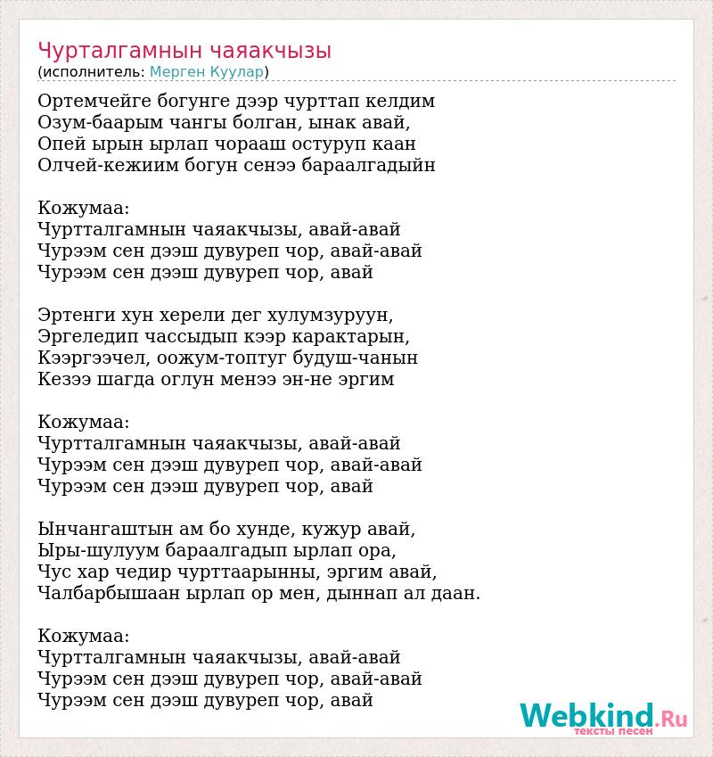 Ортемчейге богунге дээр чурттап келдим Озум-баарым чангы болган, ынак авай, Опей ырын ырлап чорааш остуруп каан Олчей-кежиим богун сенээ бараалгадыйн Кожумаа: Чуртталгамнын чаяакчызы, авай-авай Чурээм сен дээш дувуреп чор, авай-авай Чурээм сен дээш дувуреп чор, авай Эртенги хун херели дег хулумзуруун, Эргеледип чассыдып кээр карактарын, Кээргээчел, оожум-топтуг будуш-чанын Кезээ шагда оглун менээ эн-не эргим Кожумаа: Чуртталгамнын чаяакчызы, авай-авай Чурээм сен дээш дувуреп чор, авай-авай Чурээм сен дээш дувуреп чор, авай Ынчангаштын ам бо хунде, кужур авай, Ыры-шулуум бараалгадып ырлап ора, Чус хар чедир чурттаарынны, эргим авай, Чалбарбышаан ырлап ор мен, дыннап ал даан. Кожумаа: Чуртталгамнын чаяакчызы, авай-авай Чурээм сен дээш дувуреп чор, авай-авай Чурээм сен дээш дувуреп чор, авай