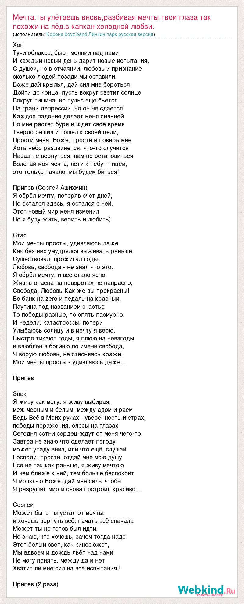 Главная→Исполнители→Корона boyz band.Линкин парк русская версия→Мечта.ты улётаешь вновь,разбивая мечты.твои глаза так похожи на лёд.в капкан хол