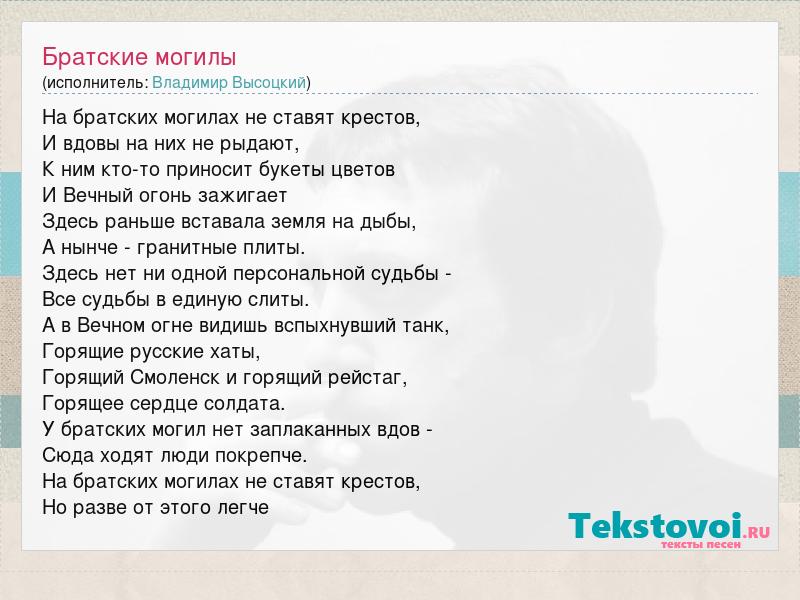 На братских могилах не ставят крестов, И вдовы на них не рыдают, К ним кто-то приносит букеты цветов И Вечный огонь зажигает Здесь раньше вставала земля на дыбы, А нынче - гранитные плиты. Здесь нет ни одной персональной судьбы - Все судьбы в единую слиты. А в Вечном огне видишь вспыхнувший танк, Горящие русские хаты, Горящий Смоленск и горящий рейстаг, Горящее сердце солдата. У братских могил нет заплаканных вдов - Сюда ходят люди покрепче. На братских могилах не ставят крестов, Но разве от этого легче