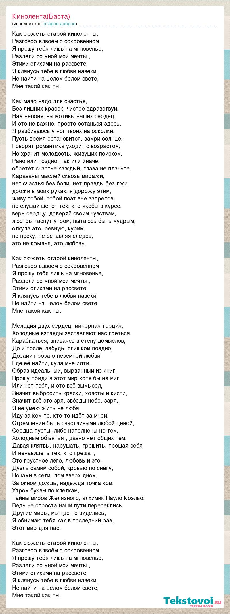 Как сюжеты старой киноленты, Разговор вдвоём о сокровенном Я прошу тебя лишь на мгновенье, Раздели со мной мои мечты , Этими стихами на рассвете, Я клянусь тебе в любви навеки, Не найти на целом белом свете, Мне такой как ты. Как мало надо для счастья, Без лишних красок, чистое здравствуй, Нам непонятны мотивы наших сердец, И это не важно, просто останься здесь, Я разбиваюсь у ног твоих на осколки, Пусть время остановится, замри солнце, Говорят романтика уходит с возрастом, Но хранит молодость, живущих поиском, Рано или поздно, так или иначе, обретёт счастье каждый, глаза не плачьте, Караваны мыслей сквозь миражи, нет счастья без боли, нет правды без лжи, дрожи в моих руках, я дорожу этим, живу тобой, собой поэт вне запретов, не слушай шепот тех, кто якобы в курсе, верь сердцу, доверяй своим чувствам, люстры гаснут утром, пытаюсь быть мудрым, откуда это, ревную, курим, по песку, не оставляя следов, это не крылья, это любовь. Как сюжеты старой киноленты, Разговор вдвоём о сокровенном Я прошу тебя лишь на мгновенье, Раздели со мной мои мечты , Этими стихами на рассвете, Я клянусь тебе в любви навеки, Не найти на целом белом свете, Мне такой как ты. Мелодия двух сердец, минорная терция, Холодные взгляды заставляют нас греться, Карабкаться, впиваясь в стену домыслов, До и после, забудь, слишком поздно, Дозами проза о неземной любви, Где её найти, куда мне идти, Образ идеальный, вырванный из книг, Прошу приди в этот мир хотя бы на миг, Или нет тебя, и это всё вымысел, Значит выбросить краски, холсты и кисти, Значит всё это зря, звёзды небо, заря, Я не умею жить не любя, Иду за кем-то, кто-то идёт за мной, Стремление быть счастливыми любой ценой, Сердца пусты, либо наполнены не тем, Холодные объятья , давно нет общих тем, Давая клятвы, нарушать, грешить, прощая себя И ненавидеть тех, кто грешат, Это грустное лего, любовь и эго, Дуэль самим собой, кровью по снегу, Ночами в сети, дом вверх дном, За окном дождь, надежда точка ком, Утром буквы по клеткам, Тайны миров Желязного, алхимик Пауло Коэльо, Ведь не спроста наши пути пересеклись, Другие миры, мы где-то виделись, Я обнимаю тебя как в последний раз, Этот мир для нас. Как сюжеты старой киноленты, Разговор вдвоём о сокровенном Я прошу тебя лишь на мгновенье, Раздели со мной мои мечты , Этими стихами на рассвете, Я клянусь тебе в любви навеки, Не найти на целом белом свете, Мне такой как ты.