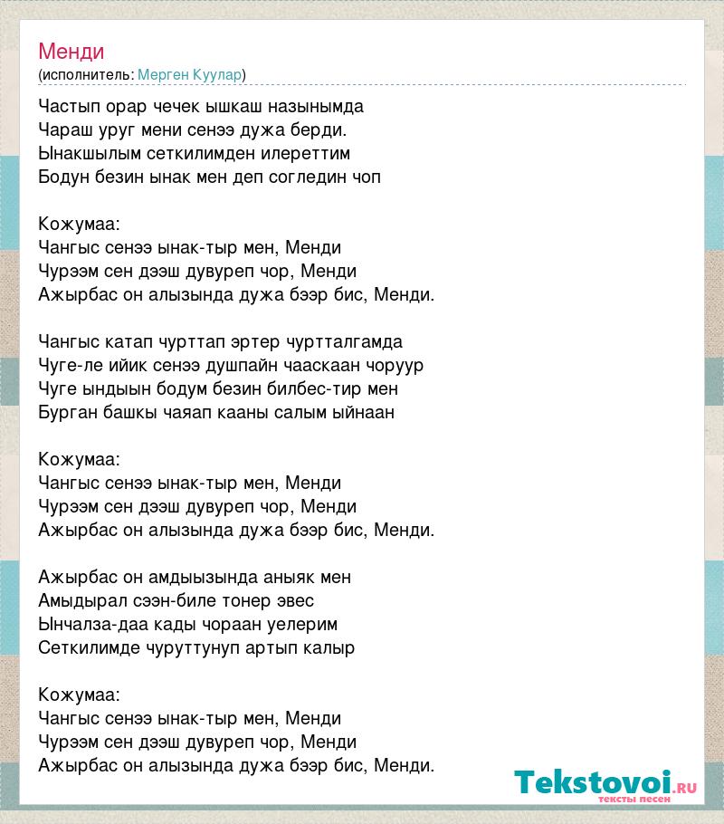 Частып орар чечек ышкаш назынымда Чараш уруг мени сенээ дужа берди. Ынакшылым сеткилимден илереттим Бодун безин ынак мен деп согледин чоп Кожумаа: Чангыс сенээ ынак-тыр мен, Менди Чурээм сен дээш дувуреп чор, Менди Ажырбас он алызында дужа бээр бис, Менди. Чангыс катап чурттап эртер чуртталгамда Чуге-ле ийик сенээ душпайн чааскаан чоруур Чуге ындыын бодум безин билбес-тир мен Бурган башкы чаяап кааны салым ыйнаан Кожумаа: Чангыс сенээ ынак-тыр мен, Менди Чурээм сен дээш дувуреп чор, Менди Ажырбас он алызында дужа бээр бис, Менди. Ажырбас он амдыызында аныяк мен Амыдырал сээн-биле тонер эвес Ынчалза-даа кады чораан уелерим Сеткилимде чуруттунуп артып калыр Кожумаа: Чангыс сенээ ынак-тыр мен, Менди Чурээм сен дээш дувуреп чор, Менди Ажырбас он алызында дужа бээр бис, Менди.