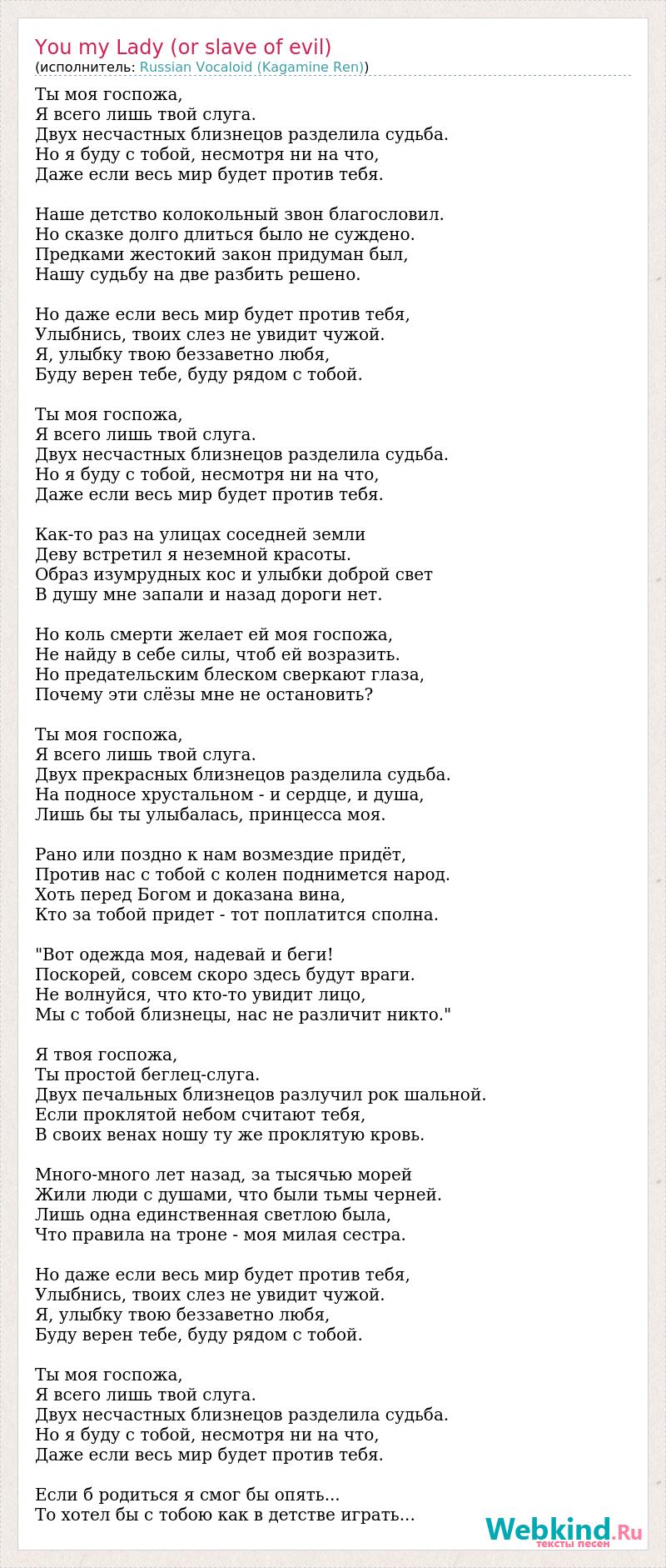Ты моя госпожа, Я всего лишь твой слуга. Двух несчастных близнецов разделила судьба. Но я буду с тобой, несмотря ни на что, Даже если весь мир будет против тебя. Наше детство колокольный звон благословил. Но сказке долго длиться было не суждено. Предками жестокий закон придуман был, Нашу судьбу на две разбить решено. Но даже если весь мир будет против тебя, Улыбнись, твоих слез не увидит чужой. Я, улыбку твою беззаветно любя, Буду верен тебе, буду рядом с тобой. Ты моя госпожа, Я всего лишь твой слуга. Двух несчастных близнецов разделила судьба. Но я буду с тобой, несмотря ни на что, Даже если весь мир будет против тебя. Как-то раз на улицах соседней земли Деву встретил я неземной красоты. Образ изумрудных кос и улыбки доброй свет В душу мне запали и назад дороги нет. Но коль смерти желает ей моя госпожа, Не найду в себе силы, чтоб ей возразить. Но предательским блеском сверкают глаза, Почему эти слёзы мне не остановить? Ты моя госпожа, Я всего лишь твой слуга. Двух прекрасных близнецов разделила судьба. На подносе хрустальном - и сердце, и душа, Лишь бы ты улыбалась, принцесса моя. Рано или поздно к нам возмездие придёт, Против нас с тобой с колен поднимется народ. Хоть перед Богом и доказана вина, Кто за тобой придет - тот поплатится сполна. "Вот одежда моя, надевай и беги! Поскорей, совсем скоро здесь будут враги. Не волнуйся, что кто-то увидит лицо, Мы с тобой близнецы, нас не различит никто." Я твоя госпожа, Ты простой беглец-слуга. Двух печальных близнецов разлучил рок шальной. Если проклятой небом считают тебя, В своих венах ношу ту же проклятую кровь. Много-много лет назад, за тысячью морей Жили люди с душами, что были тьмы черней. Лишь одна единственная светлою была, Что правила на троне - моя милая сестра. Но даже если весь мир будет против тебя, Улыбнись, твоих слез не увидит чужой. Я, улыбку твою беззаветно любя, Буду верен тебе, буду рядом с тобой. Ты моя госпожа, Я всего лишь твой слуга. Двух несчастных близнецов разделила судьба. Но я буду с тобой, несмотря ни на что, Даже если весь мир будет против тебя. Если б родиться я смог бы опять... То хотел бы с тобою как в детстве играть...