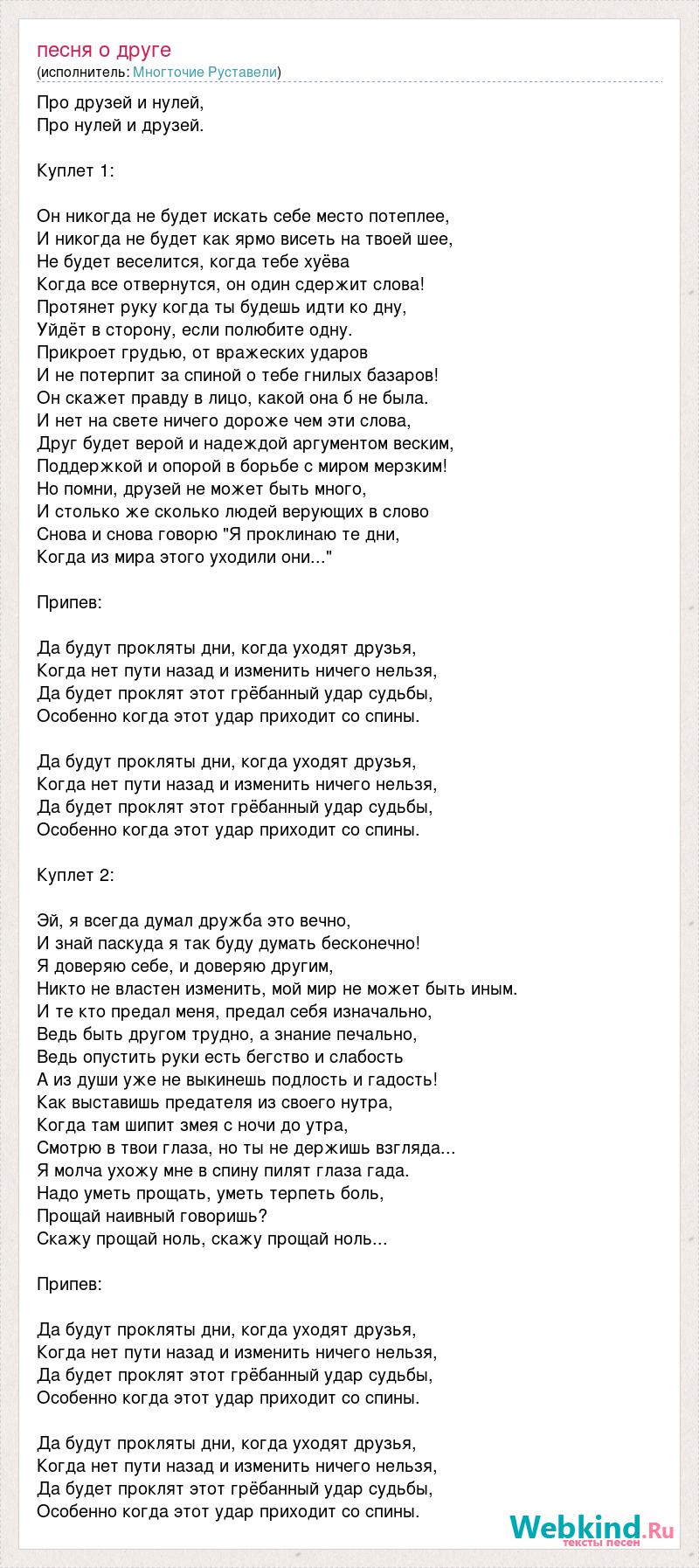 Про друзей и нулей, Про нулей и друзей. Куплет 1: Он никогда не будет искать себе место потеплее, И никогда не будет как ярмо висеть на твоей шее, Не будет веселится, когда тебе хуёва Когда все отвернутся, он один сдержит слова! Протянет руку когда ты будешь идти ко дну, Уйдёт в сторону, если полюбите одну. Прикроет грудью, от вражеских ударов И не потерпит за спиной о тебе гнилых базаров! Он скажет правду в лицо, какой она б не была. И нет на свете ничего дороже чем эти слова, Друг будет верой и надеждой аргументом веским, Поддержкой и опорой в борьбе с миром мерзким! Но помни, друзей не может быть много, И столько же сколько людей верующих в слово Снова и снова говорю "Я проклинаю те дни, Когда из мира этого уходили они..." Припев: Да будут прокляты дни, когда уходят друзья, Когда нет пути назад и изменить ничего нельзя, Да будет проклят этот грёбанный удар судьбы, Особенно когда этот удар приходит со спины. Да будут прокляты дни, когда уходят друзья, Когда нет пути назад и изменить ничего нельзя, Да будет проклят этот грёбанный удар судьбы, Особенно когда этот удар приходит со спины. Куплет 2: Эй, я всегда думал дружба это вечно, И знай паскуда я так буду думать бесконечно! Я доверяю себе, и доверяю другим, Никто не властен изменить, мой мир не может быть иным. И те кто предал меня, предал себя изначально, Ведь быть другом трудно, а знание печально, Ведь опустить руки есть бегство и слабость А из души уже не выкинешь подлость и гадость! Как выставишь предателя из своего нутра, Когда там шипит змея с ночи до утра, Смотрю в твои глаза, но ты не держишь взгляда... Я молча ухожу мне в спину пилят глаза гада. Надо уметь прощать, уметь терпеть боль, Прощай наивный говоришь? Скажу прощай ноль, скажу прощай ноль... Припев: Да будут прокляты дни, когда уходят друзья, Когда нет пути назад и изменить ничего нельзя, Да будет проклят этот грёбанный удар судьбы, Особенно когда этот удар приходит со спины. Да будут прокляты дни, когда уходят друзья, Когда нет пути назад и изменить ничего нельзя, Да будет проклят этот грёбанный удар судьбы, Особенно когда этот удар приходит со спины.
