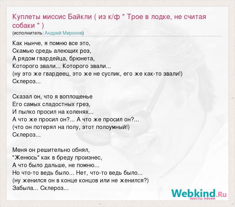 Главная→Исполнители→Андрей Миронов→Куплеты миссис Байкли ( из к/ф " Трое в лодке, не считая собаки " )