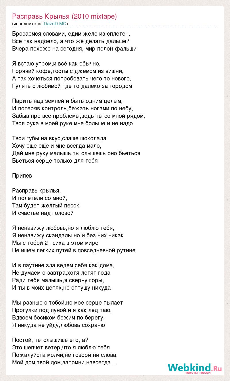 Бросаемся словами, едим желе из сплетен, Всё так надоело, а что же делать дальше? Вчера похоже на сегодня, мир полон фальши Я встаю утром,и всё как обычно, Горячий кофе,тосты с джемом из вишни, А так хочеться попробовать чего то нового, Гулять с любимой где то далеко за городом Парить над землей и быть одним целым, И потеряв контроль,бежать ногами по небу, Забыв про все проблемы,ведь ты со мной рядом, Твоя рука в моей руке,мне больше и не надо Твои губы на вкус,слаще шоколада Хочу еще еще и мне всегда мало, Дай мне руку малышь,ты слышешь оно бьеться Бьеться серце только для тебя Припев Расправь крылья, И полетели со мной, Там будет желтый песок И счастье над головой Я ненавижу любовь,но я люблю тебя, Я ненавижу скандалы,но и без них никак Мы с тобой 2 психа в этом мире Не ищем легких путей в повседневной рутине И в паутине зла,ведем себя как дома, Не думаем о завтра,хотя летят года Ради тебя малышь,я сверну горы, И ты в моих цепях,не отпущу никуда Мы разные с тобой,но мое серце пылает Прогулки под луной,и я как лед таю, Вдвоем босиком бежим по берегу, Я никуда не уйду,любовь сохраню Постой, ты слышишь это, а? Это шепчет ветер,что я люблю тебя Пожалуйста молчи,не говори ни слова, Мой дом,твой дом,запомни навсегда...
