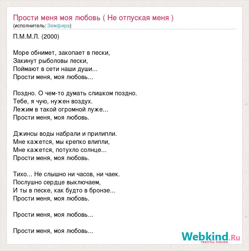 П.М.М.Л. (2000) Море обнимет, закопает в пески, Закинут рыболовы лески, Поймают в сети наши души... Прости меня, моя любовь... Поздно. О чем-то думать слишком поздно. Тебе, я чую, нужен воздух. Лежим в такой огромной луже... Прости меня, моя любовь. Джинсы воды набрали и прилипли. Мне кажется, мы крепко влипли, Мне кажется, потухло солнце... Прости меня, моя любовь. Тихо... Не слышно ни часов, ни чаек. Послушно сердце выключаем, И ты в песке, как будто в бронзе... Прости меня, моя любовь. Прости меня, моя любовь... Прости меня, моя любовь...