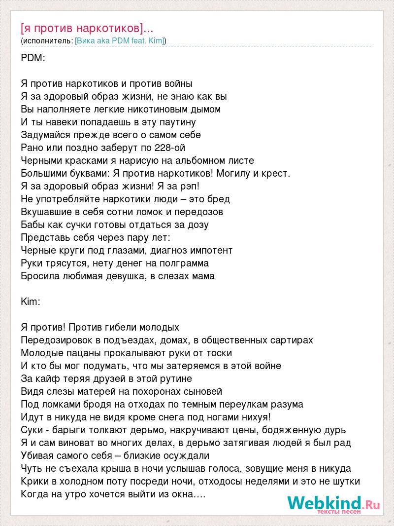 PDM: Я против наркотиков и против войны Я за здоровый образ жизни, не знаю как вы Вы наполняете легкие никотиновым дымом И ты навеки попадаешь в эту паутину Задумайся прежде всего о самом себе Рано или поздно заберут по 228-ой Черными красками я нарисую на альбомном листе Большими буквами: Я против наркотиков! Могилу и крест. Я за здоровый образ жизни! Я за рэп! Не употребляйте наркотики люди – это бред Вкушавшие в себя сотни ломок и передозов Бабы как сучки готовы отдаться за дозу Представь себя через пару лет: Черные круги под глазами, диагноз импотент Руки трясутся, нету денег на полграмма Бросила любимая девушка, в слезах мама Kim: Я против! Против гибели молодых Передозировок в подъездах, домах, в общественных сартирах Молодые пацаны прокалывают руки от тоски И кто бы мог подумать, что мы затеряемся в этой войне За кайф теряя друзей в этой рутине Видя слезы матерей на похоронах сыновей Под ломками бродя на отходах по темным переулкам разума Идут в никуда не видя кроме снега под ногами нихуя! Суки - барыги толкают дерьмо, накручивают цены, бодяженную дурь Я и сам виноват во многих делах, в дерьмо затягивая людей я был рад Убивая самого себя – близкие осуждали Чуть не съехала крыша в ночи услышав голоса, зовущие меня в никуда Крики в холодном поту посреди ночи, отходосы неделями и это не шутки Когда на утро хочется выйти из окна….