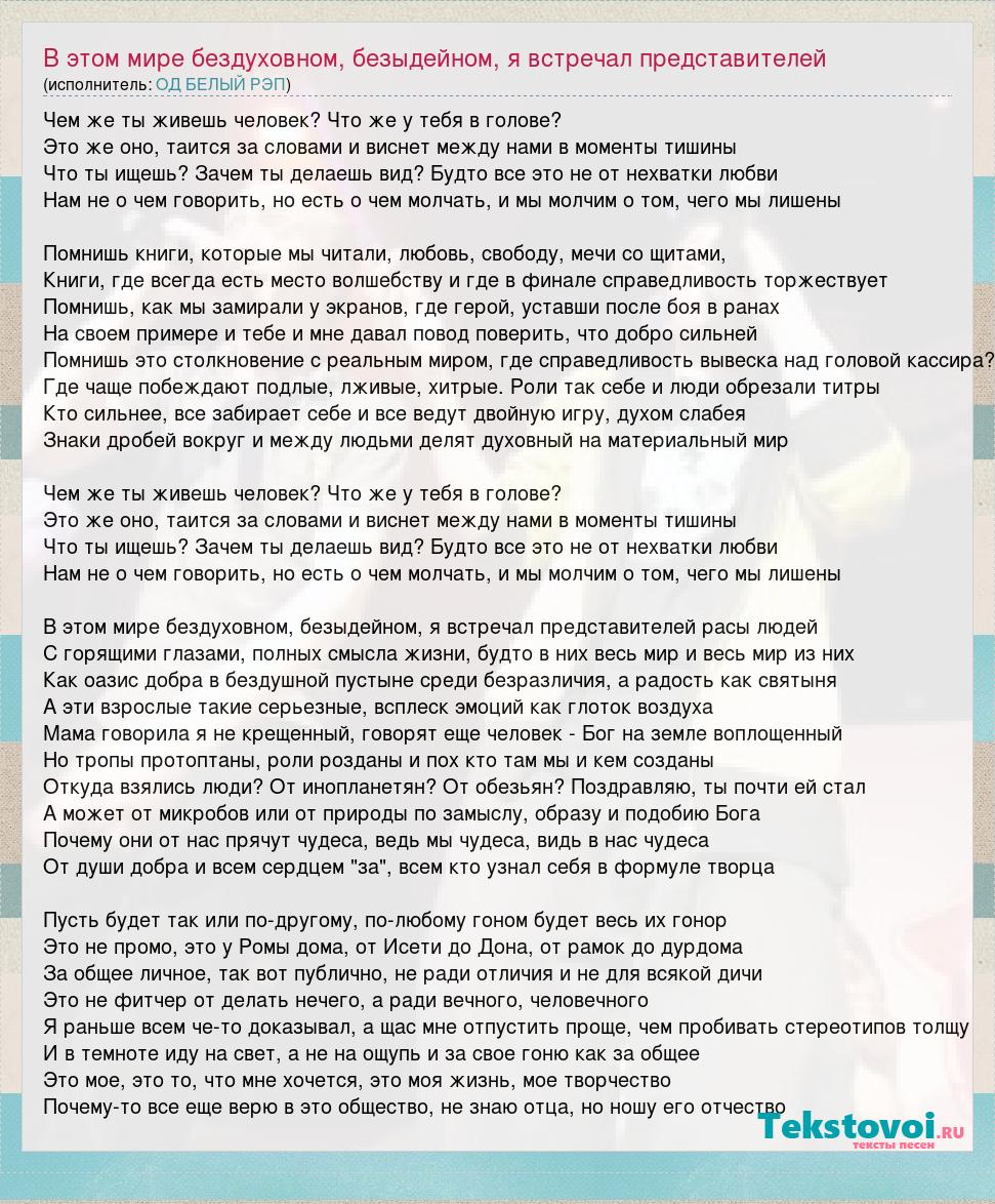 Главная→Исполнители→Од Белый Рэп→В этом мире бездуховном, безыдейном, я встречал представителей расы людей С горя