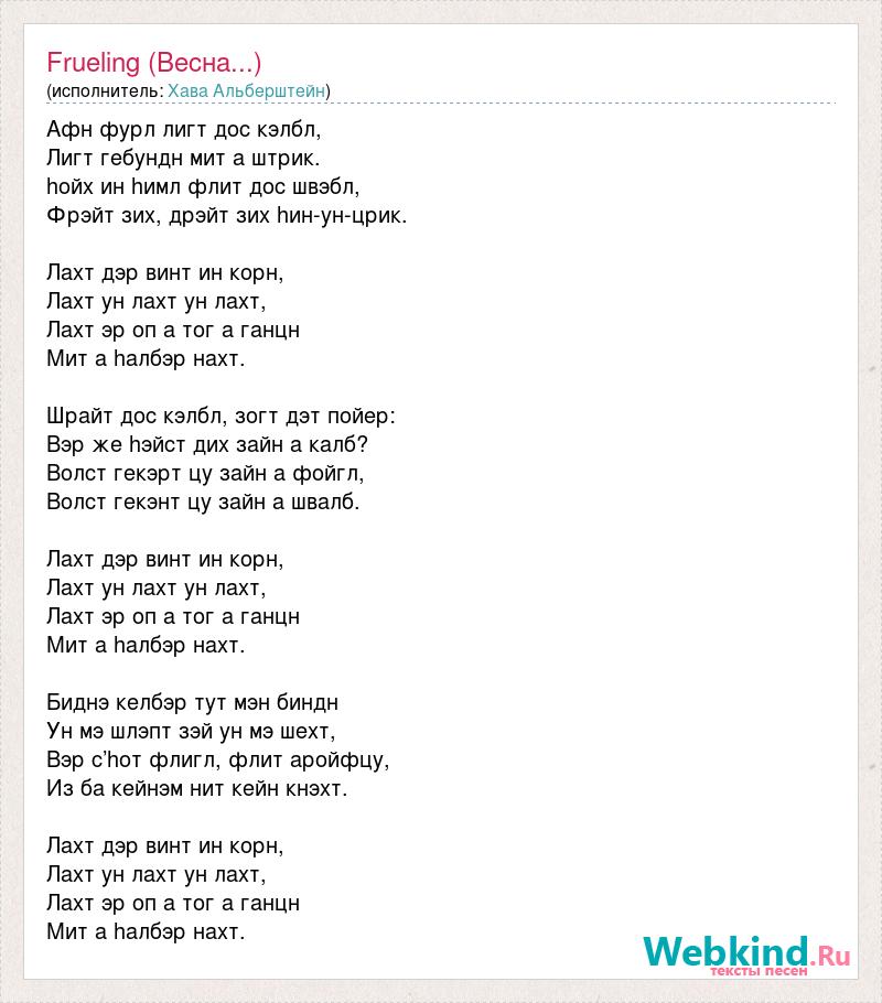 Афн фурл лигт дос кэлбл, Лигт гебундн мит а штрик. hойх ин hимл флит дос швэбл, Фрэйт зих, дрэйт зих hин-ун-црик. Лахт дэр винт ин корн, Лахт ун лахт ун лахт, Лахт эр оп а тог а ганцн Мит а hалбэр нахт. Шрайт дос кэлбл, зогт дэт пойер: Вэр же hэйст дих зайн а калб? Волст гекэрт цу зайн а фойгл, Волст гекэнт цу зайн а швалб. Лахт дэр винт ин корн, Лахт ун лахт ун лахт, Лахт эр оп а тог а ганцн Мит а hалбэр нахт. Биднэ келбэр тут мэн биндн Ун мэ шлэпт зэй ун мэ шехт, Вэр с’hот флигл, флит аройфцу, Из ба кейнэм нит кейн кнэхт. Лахт дэр винт ин корн, Лахт ун лахт ун лахт, Лахт эр оп а тог а ганцн Мит а hалбэр нахт.