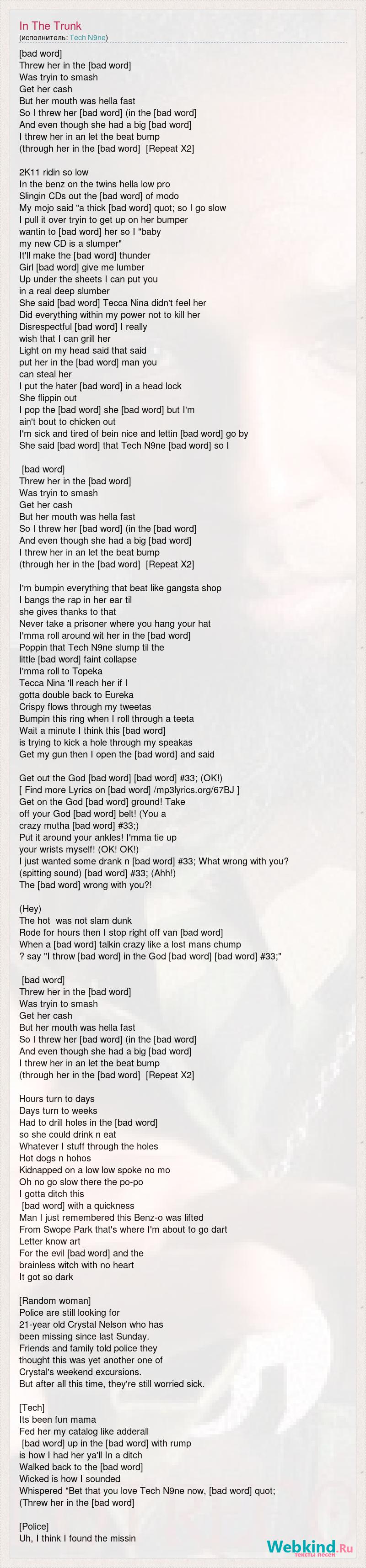 [bad word] Threw her in the [bad word] Was tryin to smash Get her cash But her mouth was hella fast So I threw her [bad word] (in the [bad word] And even though she had a big [bad word] I threw her in an let the beat bump (through her in the [bad word] [Repeat X2] 2K11 ridin so low In the benz on the twins hella low pro Slingin CDs out the [bad word] of modo My mojo said "a thick [bad word] quot; so I go slow I pull it over tryin to get up on her bumper wantin to [bad word] her so I "baby my new CD is a slumper" It'll make the [bad word] thunder Girl [bad word] give me lumber Up under the sheets I can put you in a real deep slumber She said [bad word] Tecca Nina didn't feel her Did everything within my power not to kill her Disrespectful [bad word] I really wish that I can grill her Light on my head said that said put her in the [bad word] man you can steal her I put the hater [bad word] in a head lock She flippin out I pop the [bad word] she [bad word] but I'm ain't bout to chicken out I'm sick and tired of bein nice and lettin [bad word] go by She said [bad word] that Tech N9ne [bad word] so I [bad word] Threw her in the [bad word] Was tryin to smash Get her cash But her mouth was hella fast So I threw her [bad word] (in the [bad word] And even though she had a big [bad word] I threw her in an let the beat bump (through her in the [bad word] [Repeat X2] I'm bumpin everything that beat like gangsta shop I bangs the rap in her ear til she gives thanks to that Never take a prisoner where you hang your hat I'mma roll around wit her in the [bad word] Poppin that Tech N9ne slump til the little [bad word] faint collapse I'mma roll to Topeka Tecca Nina 'll reach her if I gotta double back to Eureka Crispy flows through my tweetas Bumpin this ring when I roll through a teeta Wait a minute I think this [bad word] is trying to kick a hole through my speakas Get my gun then I open the [bad word] and said Get out the God [bad word] [bad word] #33; (OK!) [ Find more Lyrics on [bad word] /mp3lyrics.org/67BJ ] Get on the God [bad word] ground! Take off your God [bad word] belt! (You a crazy mutha [bad word] #33;) Put it around your ankles! I'mma tie up your wrists myself! (OK! OK!) I just wanted some drank n [bad word] #33; What wrong with you? (spitting sound) [bad word] #33; (Ahh!) The [bad word] wrong with you?! (Hey) The hot was not slam dunk Rode for hours then I stop right off van [bad word] When a [bad word] talkin crazy like a lost mans chump ? say "I throw [bad word] in the God [bad word] [bad word] #33;" [bad word] Threw her in the [bad word] Was tryin to smash Get her cash But her mouth was hella fast So I threw her [bad word] (in the [bad word] And even though she had a big [bad word] I threw her in an let the beat bump (through her in the [bad word] [Repeat X2] Hours turn to days Days turn to weeks Had to drill holes in the [bad word] so she could drink n eat Whatever I stuff through the holes Hot dogs n hohos Kidnapped on a low low spoke no mo Oh no go slow there the po-po I gotta ditch this [bad word] with a quickness Man I just remembered this Benz-o was lifted From Swope Park that's where I'm about to go dart Letter know art For the evil [bad word] and the brainless witch with no heart It got so dark [Random woman] Police are still looking for 21-year old Crystal Nelson who has been missing since last Sunday. Friends and family told police they thought this was yet another one of Crystal's weekend excursions. But after all this time, they're still worried sick. [Tech] Its been fun mama Fed her my catalog like adderall [bad word] up in the [bad word] with rump is how I had her ya'll In a ditch Walked back to the [bad word] Wicked is how I sounded Whispered "Bet that you love Tech N9ne now, [bad word] quot; (Threw her in the [bad word] [Police] Uh, I think I found the missin