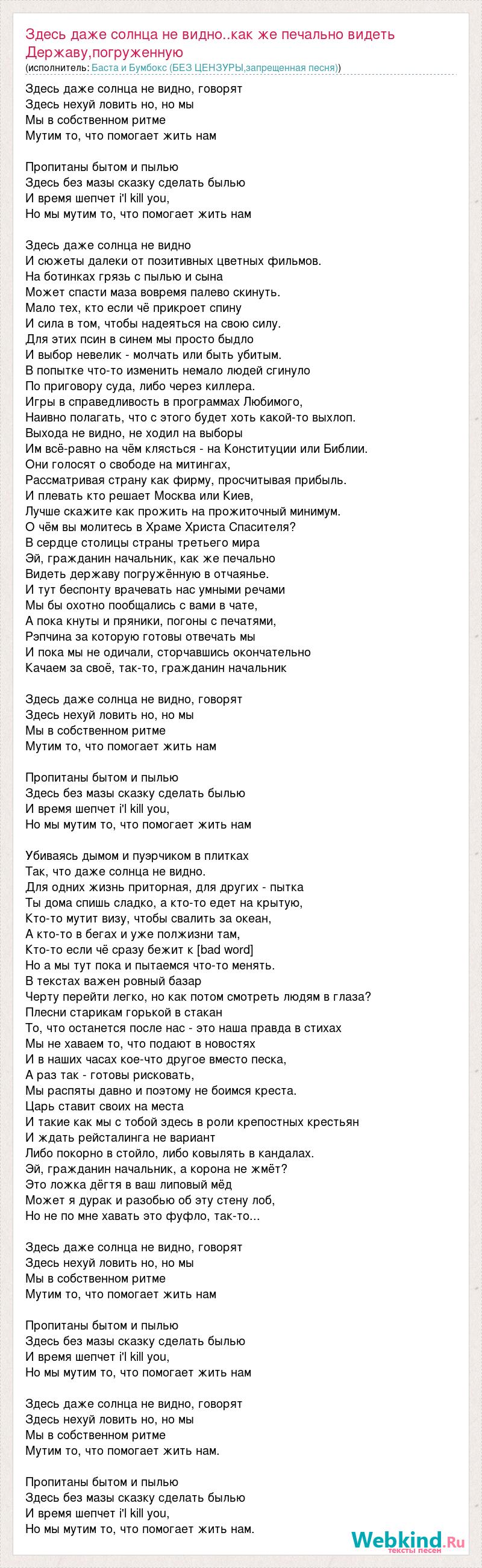 Главная→Исполнители→Баста и Бумбокс (БЕЗ ЦЕНЗУРЫ,запрещенная песня)→Здесь даже солнца не видно..как же печально видеть Державу,погруженную в отчая