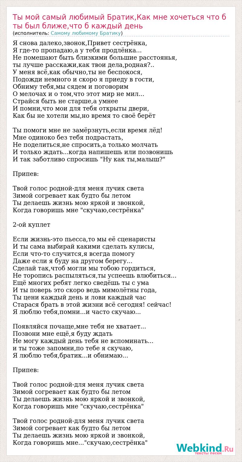 Я снова далеко,звонок,Привет сестрёнка, Я где-то пропадаю,а у тебя продлёнка... Не помешают быть близкими большие расстоянья, ты лучше расскажи,как твои дела,родная?.. У меня всё,как обычно,ты не беспокося, Подожди немного и скоро я приеду в гости, Обниму тебя,мы сядем и поговорим О мелочах и о том,что этот мир не мил... Страйся быть не старше,а умнее И помни,что мои для тебя открыты двери, Как бы не хотели мы,но время то своё берёт Ты помоги мне не замёрзнуть,если время лёд! Мне одиноко без тебя подрастать, Не поделиться,не спросить,а только молчать И только ждать...когда напишешь или позвонишь И так заботливо спросишь "Ну как ты,малыш?" Припев: Твой голос родной-для меня лучик света Зимой согревает как будто бы летом Ты делаешь жизнь мою яркой и звонкой, Когда говоришь мне "скучаю,сестрёнка" 2-ой куплет Если жизнь-это пьесса,то мы её сценаристы И ты сама выбирай какими сделать кулисы, Если что-то случится,я всегда помогу Даже если я буду на другом берегу... Сделай так,чтоб могли мы тобою гордиться, Не торопись распыляться,ты успеешь влюбиться... Ещё многих ребят легко сведёшь ты с ума И ты поверь это скоро ведь мимолётны года, Ты цени каждый день и лови каждый час Старася брать в этой жизни всё сегодня! сейчас! Я люблю тебя,помни...и часто скучаю... Появляйся почаще,мне тебя не хватает... Позвони мне ещё,я буду ждать Не могу каждый день тебя не вспоминать... и ты тоже запомни,по тебе я скучаю, Я люблю тебя,братик...и обнимаю... Припев: Твой голос родной-для меня лучик света Зимой согревает как будто бы летом Ты делаешь жизнь мою яркой и звонкой, Когда говоришь мне "скучаю,сестрёнка" Твой голос родной-для меня лучик света Зимой согревает как будто бы летом Ты делаешь жизнь мою яркой и звонкой, Когда говоришь мне..."скучаю,сестрёнка"